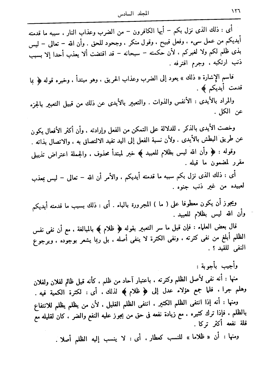 وقوله: وَأَنَّ اللَّهَ لَيْسَ بِظَلَّامٍ لِلْعَبِيدِ خبر لمبتدأ محذوف، والجملة اعتراض تذييلى مقرر لمضمون ما قبله.