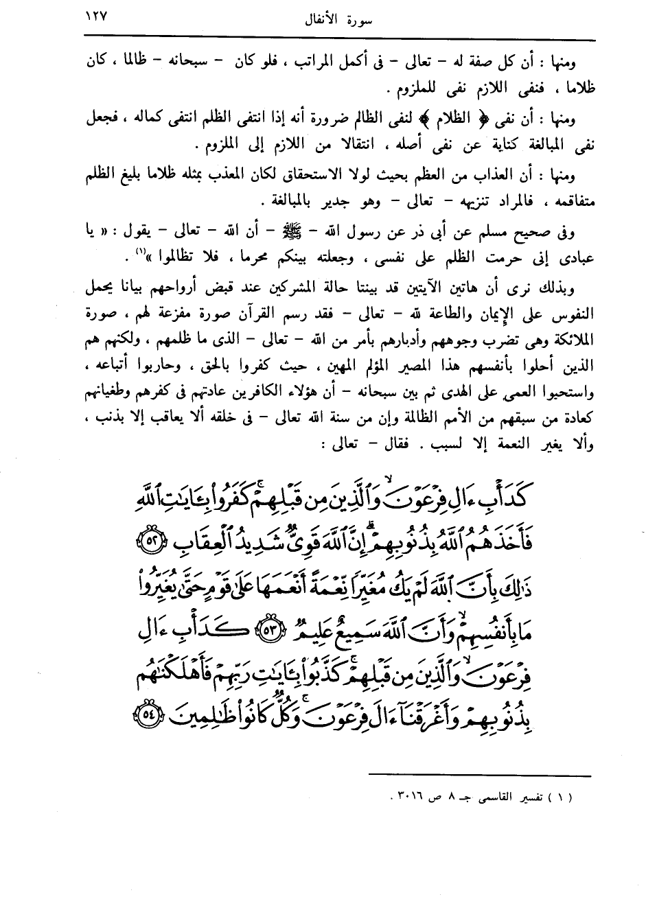 وبذلك نرى أن هاتين الآيتين قد بينتا حالة المشركين عند قبض أرواحهم بيانا يحمل النفوس على الإيمان والطاعة لله- تعالى- فقد رسم القرآن صورة مفزعة لهم، صورة الملائكة وهي تضرب وجوههم وأدبارهم بأمر من الله- تعالى- الذي ما ظلمهم، ولكنهم هم الذين أحلوا بأنفسهم هذا المصير المؤلم المهين، حيث كفروا بالحق، وحاربوا أتباعه، واستحبوا العمى على الهدى ثم بين سبحانه- أن هؤلاء الكافرين عادتهم في كفرهم وطغيانهم كعادة من سبقهم من الأمم الظالمة وإن من سنة الله تعالى- في خلقه ألا يعاقب إلا بذنب، وألا يغير النعمة إلا لسبب. فقال- تعالى: