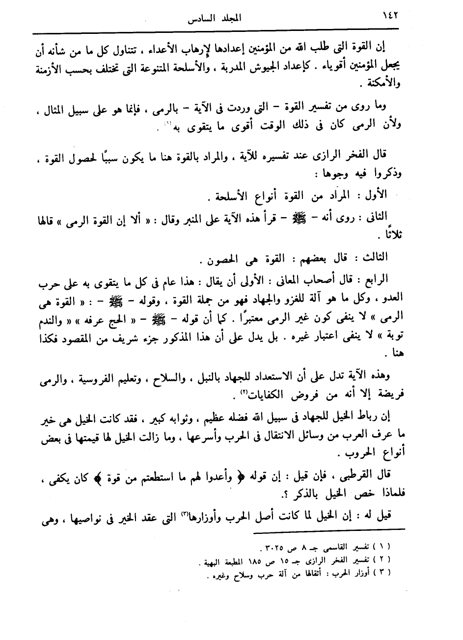 الرابع: قال أصحاب المعاني: الأولى أن يقال: هذا عام في كل ما يتقوى به على حرب العدو، وكل ما هو آلة للغزو والجهاد فهو من جملة القوة، وقوله صلى الله عليه وسلم: «القوة هي الرمي» لا ينفى كون غير الرمي معتبرا. كما أن قوله صلى الله عليه وسلم «الحج عرفة» «والندم توبة» لا ينفى اعتبار غيره. بل يدل على أن هذا المذكور جزء شريف من المقصود فكذا هنا.