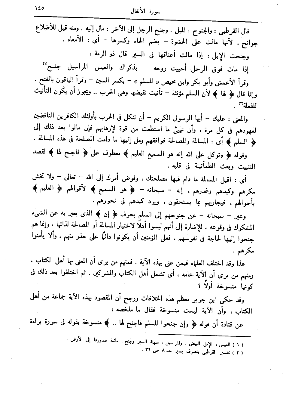 عن قتادة أن قوله وَإِنْ جَنَحُوا لِلسَّلْمِ فَاجْنَحْ لَها.. منسوخة بقوله في سورة براءة