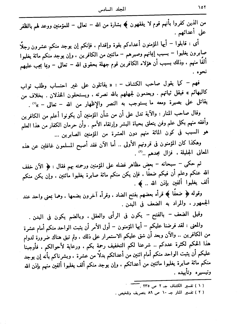 وقال صاحب المنار: والآية تدل على أن من شأن المؤمنين أن يكونوا أعلم من الكافرين وأفقه منهم بكل علم وفن يتعلق بحياة البشر وارتقاء الأمم. وأن حرمان الكفار من هذا العلم هو السبب في كون المائة منهم دون العشرة من المؤمنين الصابرين ...