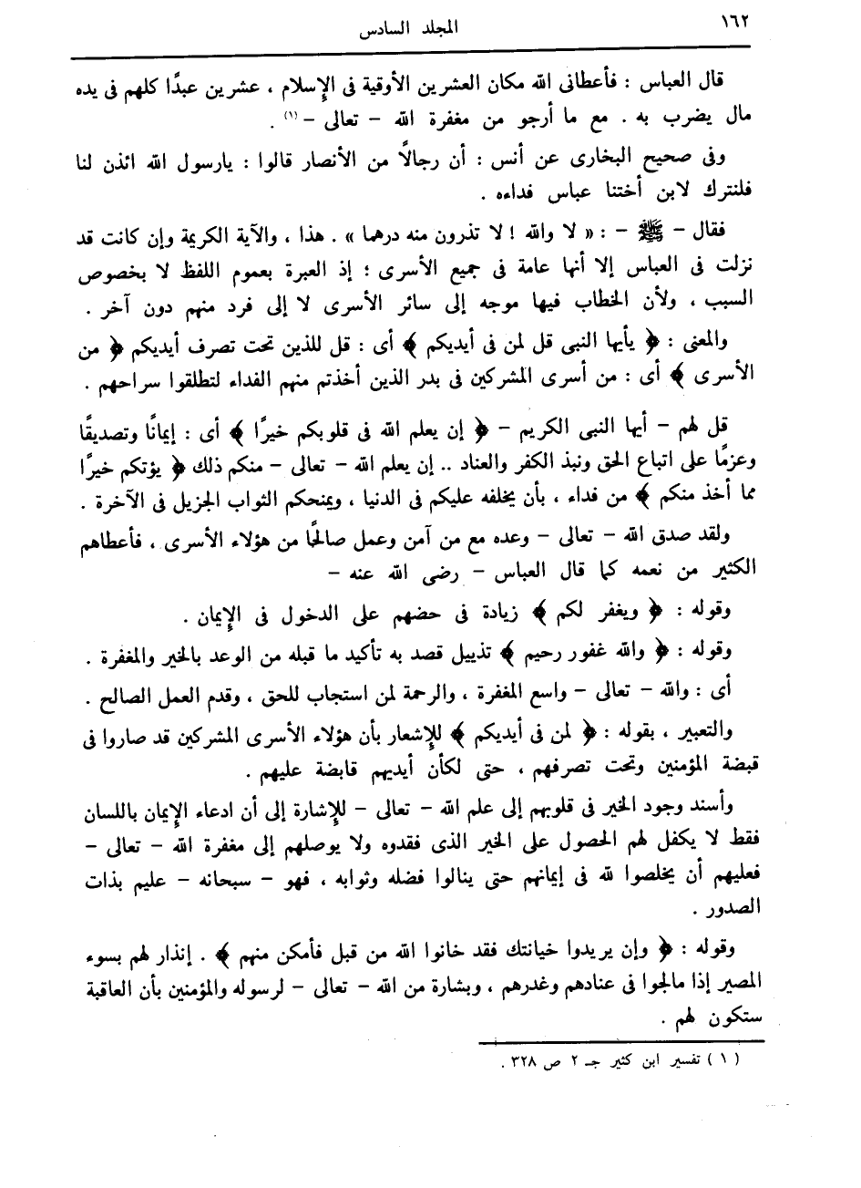 فقال صلى الله عليه وسلم: «لا والله! لا تذرون منه درهما» . هذا، والآية الكريمة وإن كانت قد نزلت في العباس إلا أنها عامة في جميع الأسرى إذ العبرة بعموم اللفظ لا بخصوص السبب، ولأن الخطاب فيها موجه إلى سائر الأسرى لا إلى فرد منهم دون آخر.