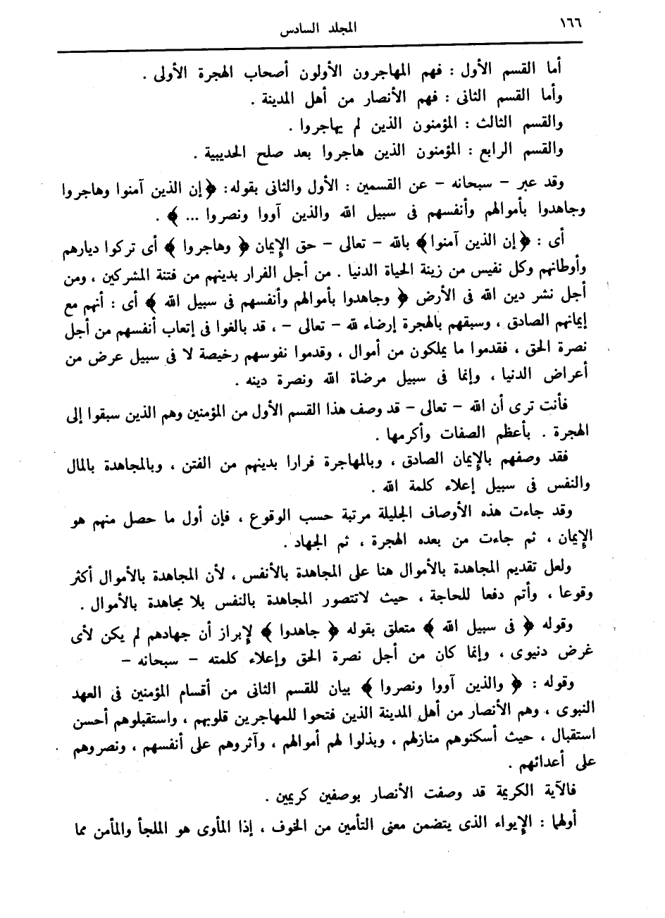 وقد عبر- سبحانه- عن القسمين: الأول والثاني بقوله: إِنَّ الَّذِينَ آمَنُوا وَهاجَرُوا وَجاهَدُوا بِأَمْوالِهِمْ وَأَنْفُسِهِمْ فِي سَبِيلِ اللَّهِ وَالَّذِينَ آوَوْا وَنَصَرُوا....