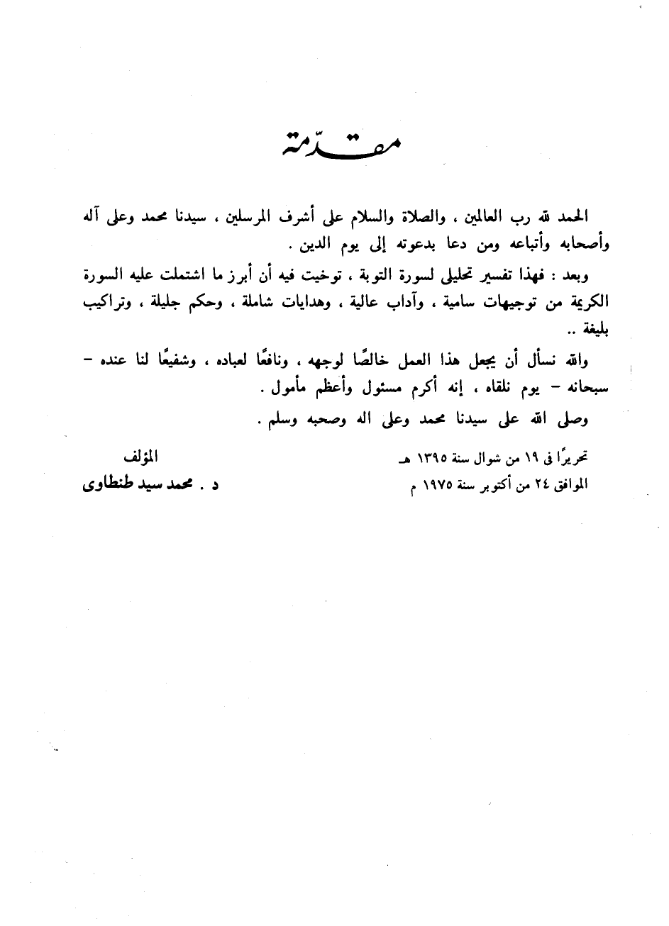 وبعد: فهذا تفسير تحليلي لسورة التوبة، توخيت فيه أن أبرز ما اشتملت عليه السورة الكريمة من توجيهات سامية، وآداب عالية، وهدايات شاملة، وحكم جليلة، وتراكيب بليغة..