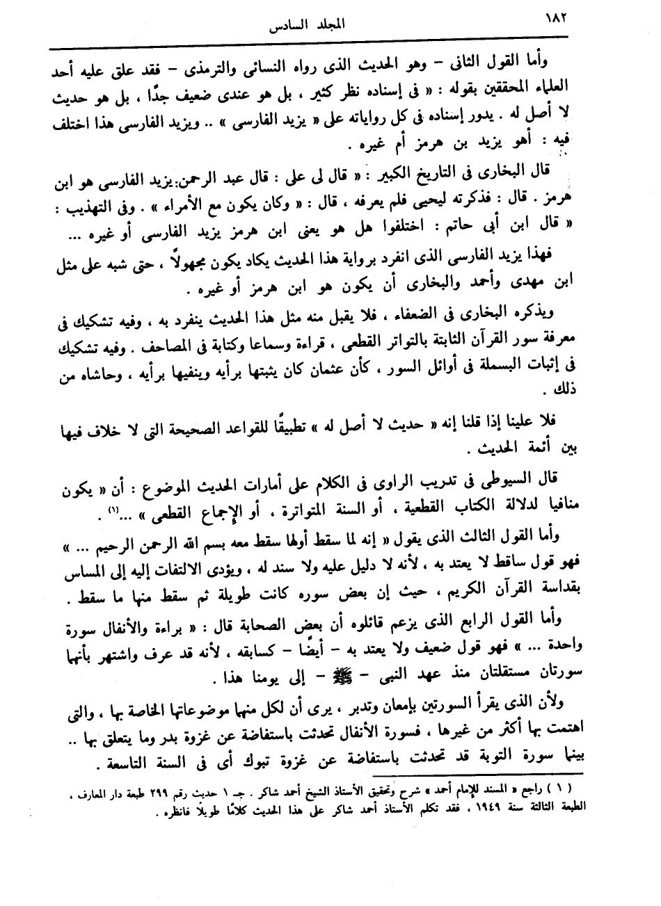 ويذكره البخاري في الضعفاء، فلا يقبل منه مثل هذا الحديث ينفرد به، وفيه تشكيك في معرفة سور القرآن الثابتة بالتواتر القطعي، قراءة وسماعا وكتابة في المصاحف. وفيه تشكيك في إثبات البسملة في أوائل السور، كأن عثمان كان يثبتها برأيه وينفيها برأيه، وحاشاه من ذلك.