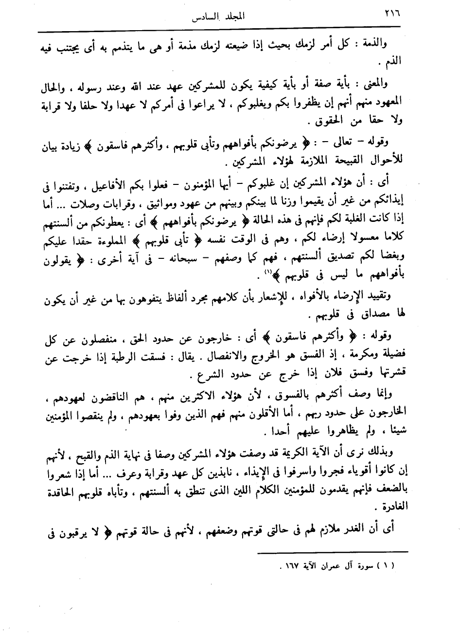 وبذلك نرى أن الآية الكريمة قد وصفت هؤلاء المشركين وصفا في نهاية الذم والقبح، لأنهم إن كانوا أقوياء فجروا وأسرفوا في الإيذاء، نابذين كل عهد وقرابة وعرف ... أما إذا شعروا بالضعف فإنهم يقدمون للمؤمنين الكلام اللين الذي تنطق به ألسنتهم، وتأباه قلوبهم الحاقدة الغادرة.