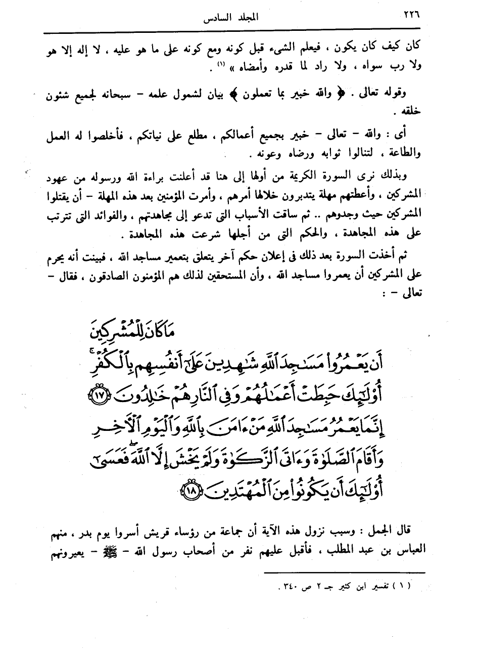 ما كانَ لِلْمُشْرِكِينَ أَنْ يَعْمُرُوا مَساجِدَ اللَّهِ شاهِدِينَ عَلى أَنْفُسِهِمْ بِالْكُفْرِ أُولئِكَ حَبِطَتْ أَعْمالُهُمْ وَفِي النَّارِ هُمْ خالِدُونَ (17) إِنَّما يَعْمُرُ مَساجِدَ اللَّهِ مَنْ آمَنَ بِاللَّهِ وَالْيَوْمِ الْآخِرِ وَأَقامَ الصَّلاةَ وَآتَى الزَّكاةَ وَلَمْ يَخْشَ إِلاَّ اللَّهَ فَعَسى أُولئِكَ أَنْ يَكُونُوا مِنَ الْمُهْتَدِينَ (18)