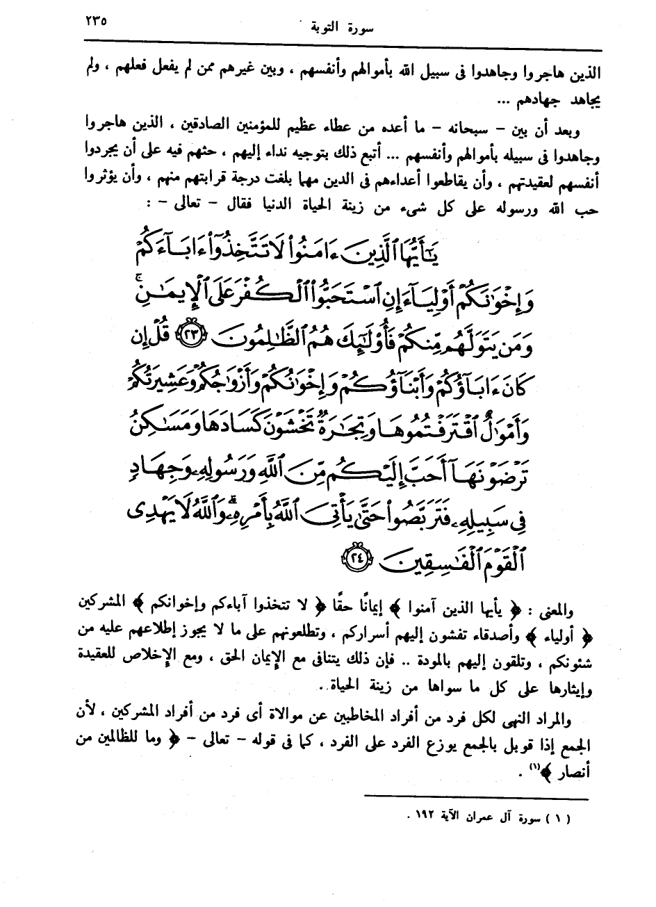 يا أَيُّهَا الَّذِينَ آمَنُوا لا تَتَّخِذُوا آباءَكُمْ وَإِخْوانَكُمْ أَوْلِياءَ إِنِ اسْتَحَبُّوا الْكُفْرَ عَلَى الْإِيمانِ وَمَنْ يَتَوَلَّهُمْ مِنْكُمْ فَأُولئِكَ هُمُ الظَّالِمُونَ (23) قُلْ إِنْ كانَ آباؤُكُمْ وَأَبْناؤُكُمْ وَإِخْوانُكُمْ وَأَزْواجُكُمْ وَعَشِيرَتُكُمْ وَأَمْوالٌ اقْتَرَفْتُمُوها وَتِجارَةٌ تَخْشَوْنَ كَسادَها وَمَساكِنُ تَرْضَوْنَها أَحَبَّ إِلَيْكُمْ مِنَ اللَّهِ وَرَسُولِهِ وَجِهادٍ فِي سَبِيلِهِ فَتَرَبَّصُوا حَتَّى يَأْتِيَ اللَّهُ بِأَمْرِهِ وَاللَّهُ لا يَهْدِي الْقَوْمَ الْفاسِقِينَ (24)
