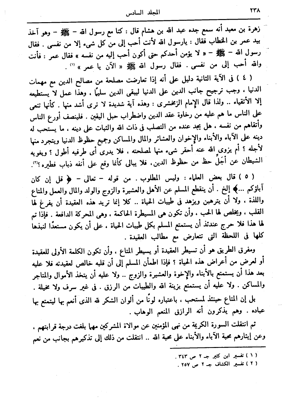 ومفرق الطريق هو أن تسيطر العقيدة أو يسيطر المتاع، وأن تكون الكلمة الأولى للعقيدة أو لعرض من أعراض هذه الحياة؟ فإذا اطمأن المسلم إلى أن قلبه خالص لعقيدته فلا عليه بعد هذا أن يستمتع بالأبناء والإخوة والعشيرة والزوج.. ولا عليه أن يتخذ الأموال والمتاجر والمساكن. ولا عليه أن يستمتع بزينة الله والطيبات من الرزق. في غير سرف ولا مخيلة.