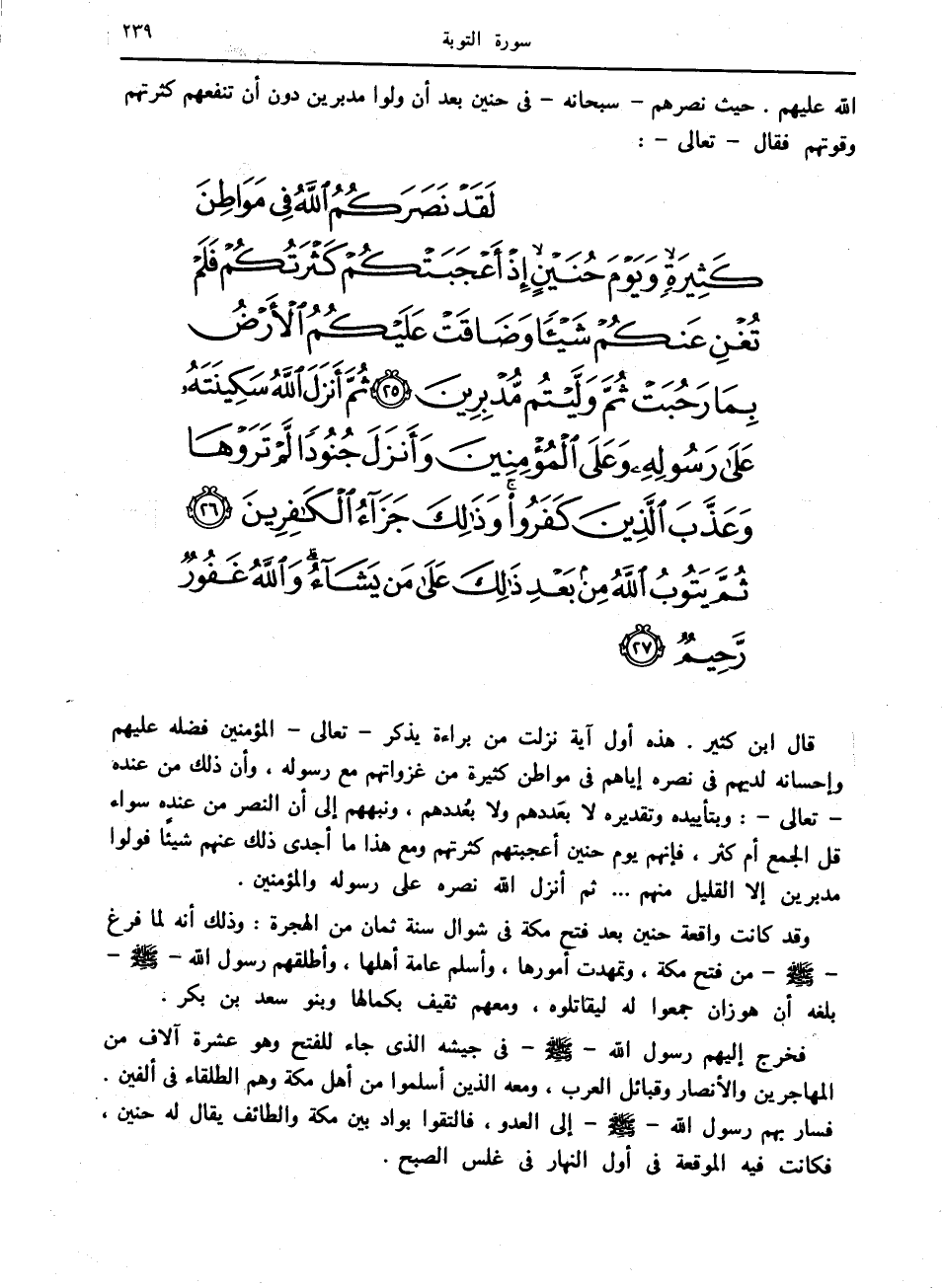 لَقَدْ نَصَرَكُمُ اللَّهُ فِي مَواطِنَ كَثِيرَةٍ وَيَوْمَ حُنَيْنٍ إِذْ أَعْجَبَتْكُمْ كَثْرَتُكُمْ فَلَمْ تُغْنِ عَنْكُمْ شَيْئاً وَضاقَتْ عَلَيْكُمُ الْأَرْضُ بِما رَحُبَتْ ثُمَّ وَلَّيْتُمْ مُدْبِرِينَ (25) ثُمَّ أَنْزَلَ اللَّهُ سَكِينَتَهُ عَلى رَسُولِهِ وَعَلَى الْمُؤْمِنِينَ وَأَنْزَلَ جُنُوداً لَمْ تَرَوْها وَعَذَّبَ الَّذِينَ كَفَرُوا وَذلِكَ جَزاءُ الْكافِرِينَ (26) ثُمَّ يَتُوبُ اللَّهُ مِنْ بَعْدِ ذلِكَ عَلى مَنْ يَشاءُ وَاللَّهُ غَفُورٌ رَحِيمٌ (27)