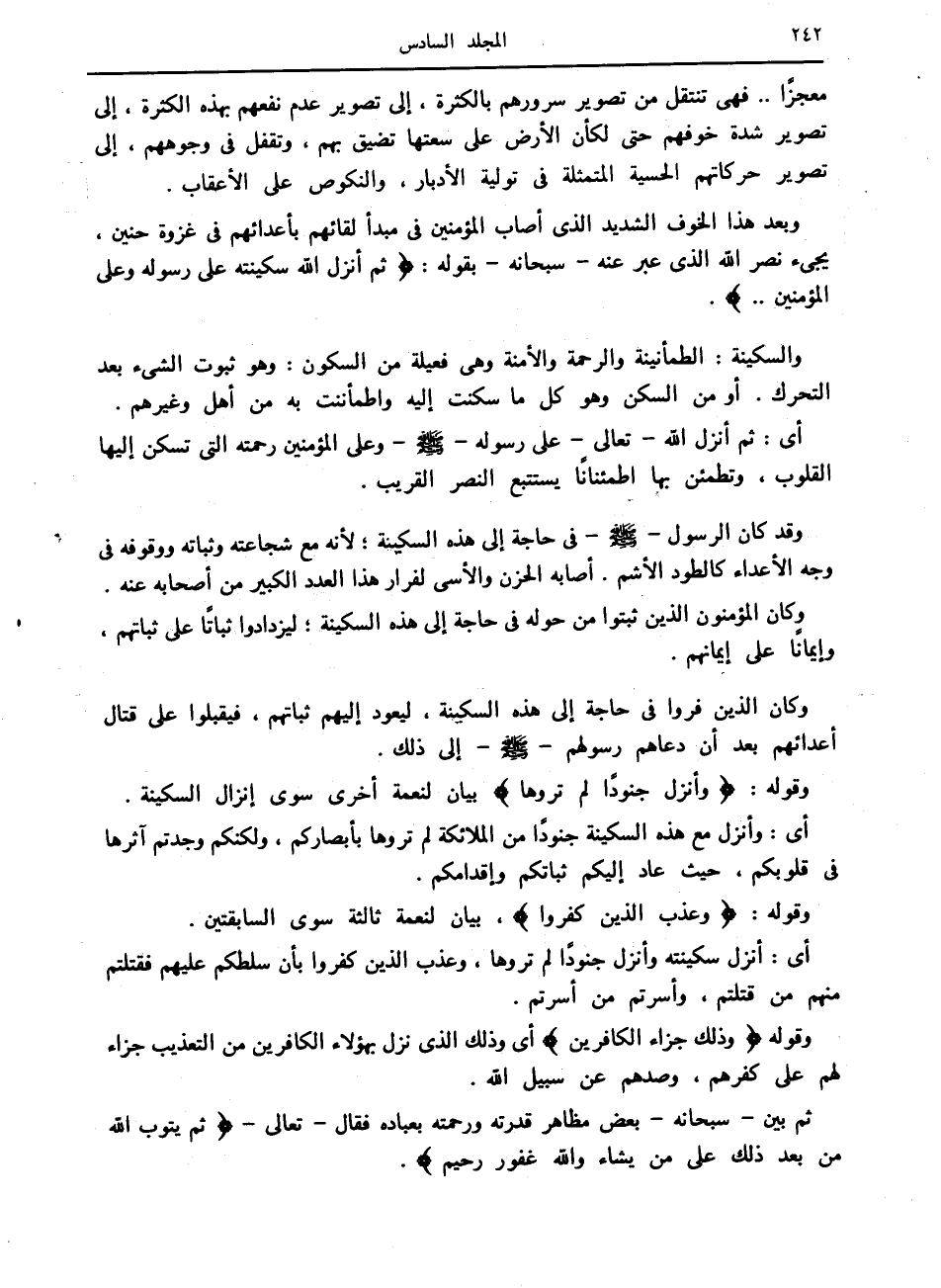 وبعد هذا الخوف الشديد الذي أصاب المؤمنين في مبدأ لقائهم بأعدائهم في غزوة حنين، يجيء نصر الله الذي عبر عنه- سبحانه- بقوله: ثُمَّ أَنْزَلَ اللَّهُ سَكِينَتَهُ عَلى رَسُولِهِ وَعَلَى الْمُؤْمِنِينَ ...