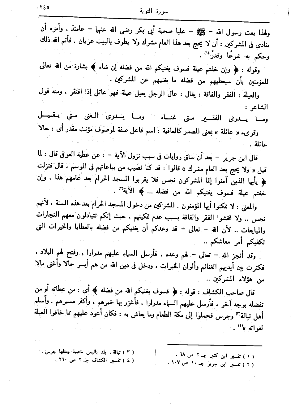 قال ابن جرير- بعد أن ساق روايات في سبب نزول الآية-: عن عطية العوفى قال: لما قيل «ولا يحج بعد العام مشرك» قالوا: قد كنا نصيب من بياعاتهم في الموسم، قال فنزلت يا أَيُّهَا الَّذِينَ آمَنُوا إِنَّمَا الْمُشْرِكُونَ نَجَسٌ فَلا يَقْرَبُوا الْمَسْجِدَ الْحَرامَ بَعْدَ عامِهِمْ هذا، وَإِنْ خِفْتُمْ عَيْلَةً فَسَوْفَ يُغْنِيكُمُ اللَّهُ مِنْ فَضْلِهِ ... الآية «2» .