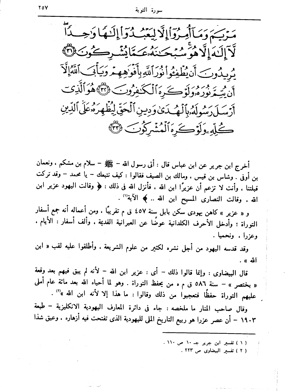 أخرج ابن جرير عن ابن عباس قال: أتى رسول الله صلى الله عليه وسلم سلام بن مشكم، ونعمان بن أوفى. وشاس بن قيس، ومالك بن الصيف فقالوا: كيف نتبعك- يا محمد- وقد تركت قبلتنا، وأنت لا تزعم أن عزيرا ابن الله، فأنزل الله في ذلك: وَقالَتِ الْيَهُودُ عُزَيْرٌ ابْنُ اللَّهِ، وَقالَتِ النَّصارى الْمَسِيحُ ابْنُ اللَّهِ.. الآية «1» .