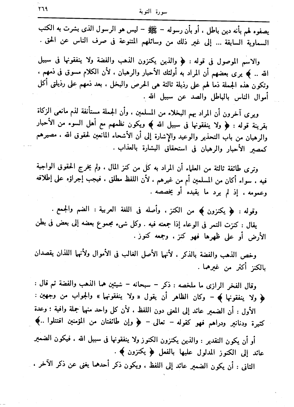 والاسم الموصول في قوله: وَالَّذِينَ يَكْنِزُونَ الذَّهَبَ وَالْفِضَّةَ وَلا يُنْفِقُونَها فِي سَبِيلِ اللَّهِ.. يرى بعضهم أن المراد به أولئك الأحبار والرهبان، لأن الكلام مسوق في ذمهم، وتكون هذه الجملة ذما لهم على رذيلة ثالثة هي الحرص والبخل، بعد ذمهم على رذيلتي أكل أموال الناس بالباطل والصد عن سبيل الله.