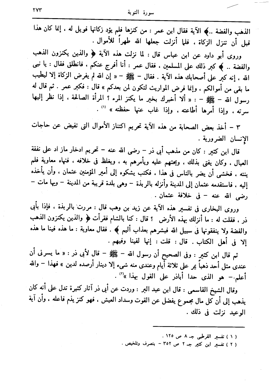 وقال الشيخ القاسمى: قال ابن عبد البر: وردت عن أبى ذر آثار كثيرة تدل على أنه كان يذهب إلى أن كل مال مجموع يفضل عن القوت وسداد العيش، فهو كنز يذم فاعله، وأن آية الوعيد نزلت في ذلك.