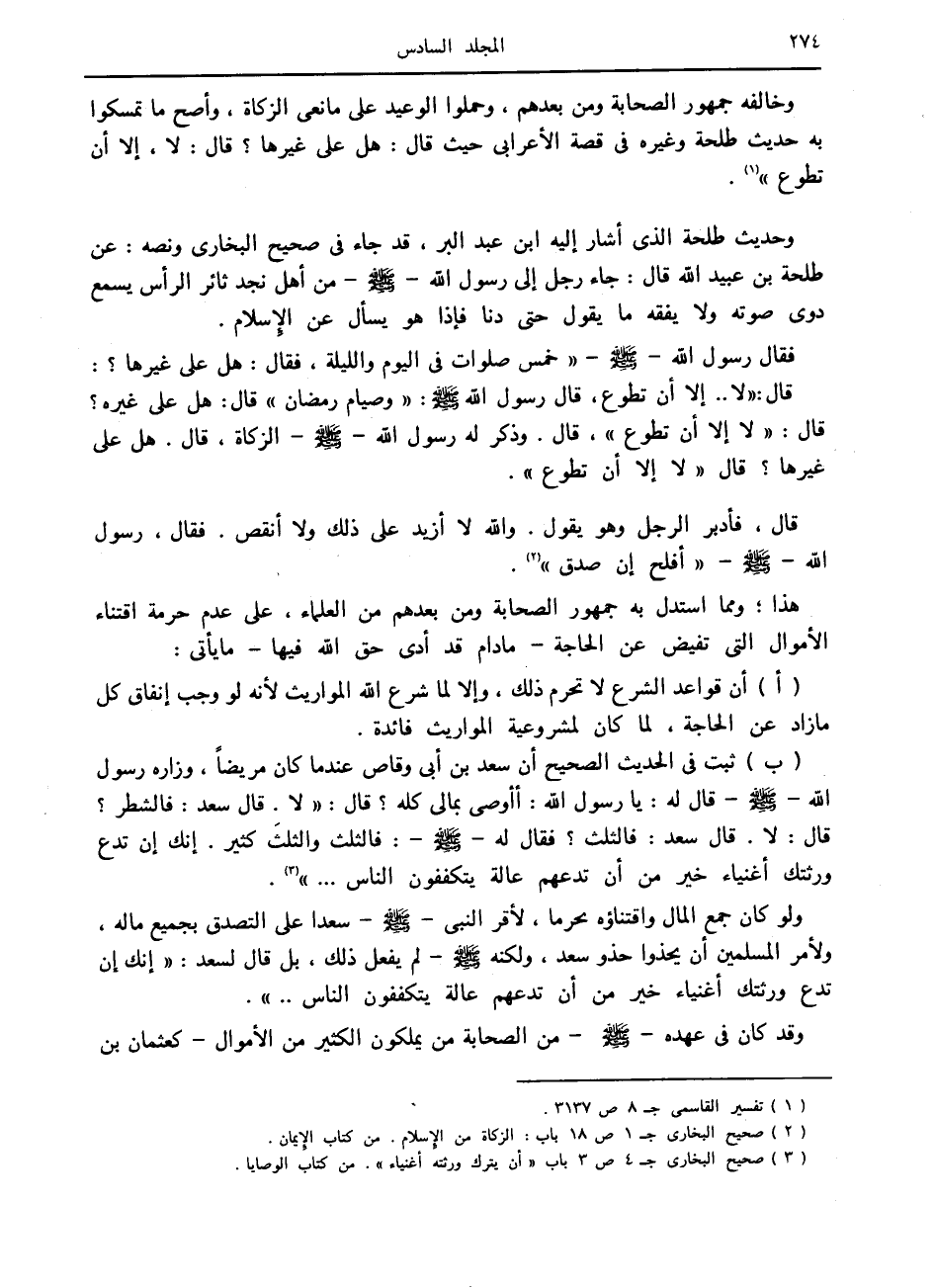 (ب) ثبت في الحديث الصحيح أن سعد بن أبى وقاص عند ما كان مريضا، وزاره رسول الله صلى الله عليه وسلم قال له: يا رسول الله: أأوصى بمالي كله؟ قال: «لا. قال سعد: فالشطر؟