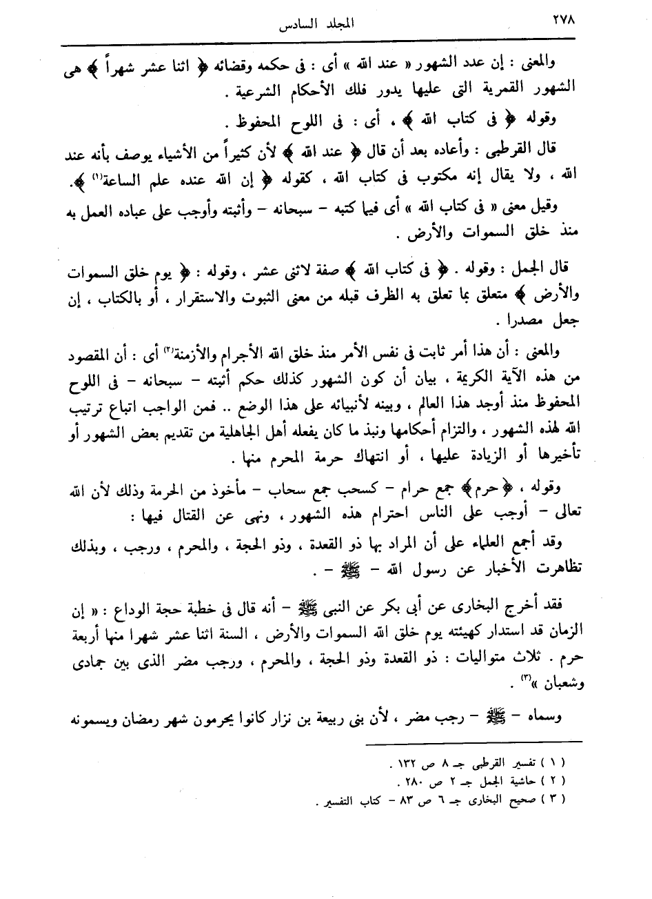 فقد أخرج البخاري عن أبى بكر عن النبي صلى الله عليه وسلم أنه قال في خطبة حجة الوداع: «إن الزمان قد استدار كهيئته يوم خلق الله السموات والأرض، السنة اثنا عشر شهرا منها أربعة حرم. ثلاث متواليات: ذو القعدة وذو الحجة، والمحرم، ورجب مضر الذي بين جمادى وشعبان» «3» .