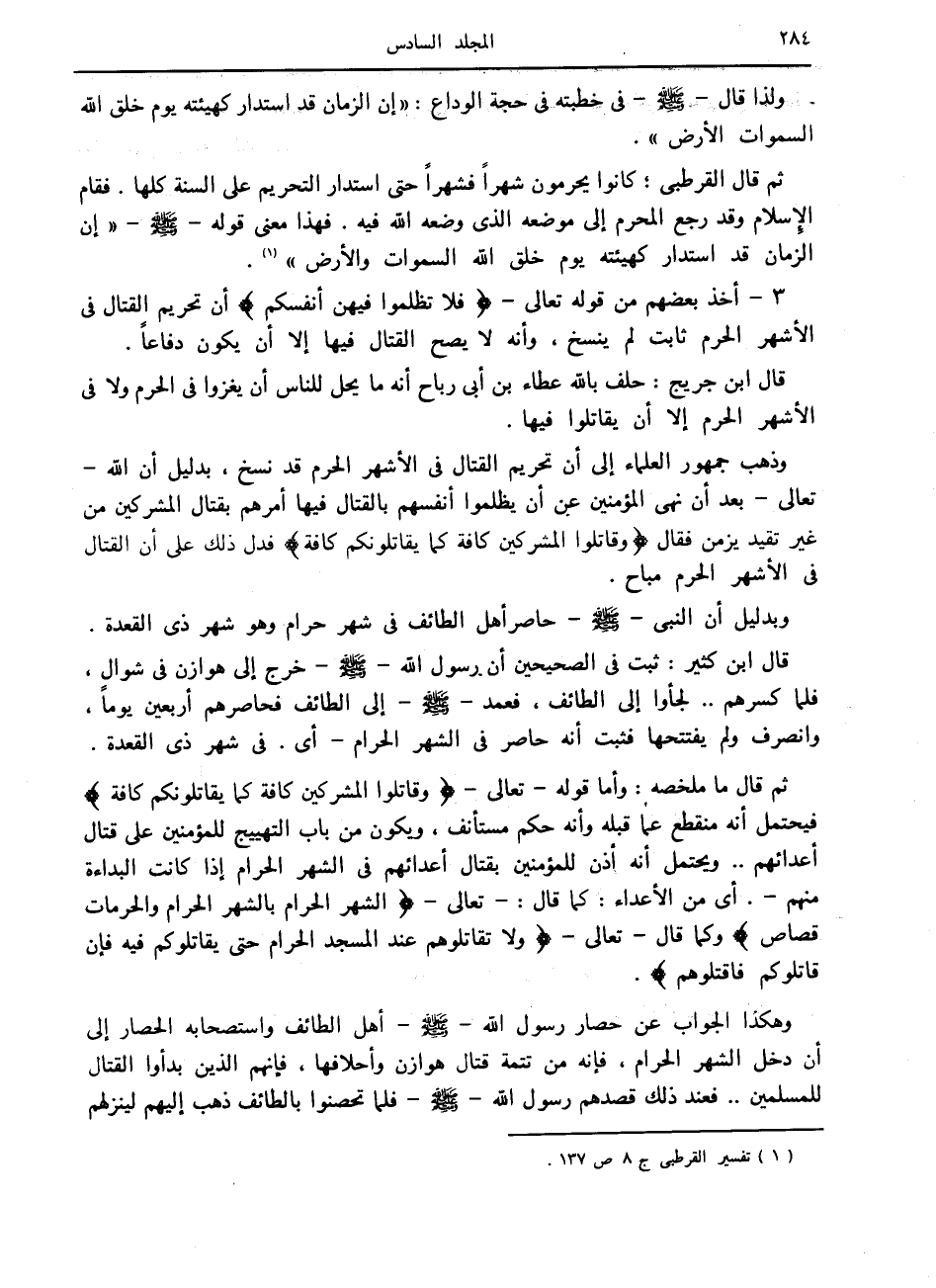 ثم قال القرطبي كانوا يحرمون شهرا فشهرا حتى استدار التحريم على السنة كلها. فقام الإسلام وقد رجع المحرم إلى موضعه الذي وضعه الله فيه. فهذا معنى قوله صلى الله عليه وسلم «إن الزمان قد استدار كهيئته يوم خلق الله السموات والأرض» «1» .