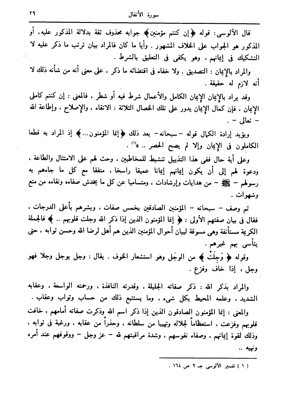 ثم وصف- سبحانه- المؤمنين الصادقين بخمس صفات، وبشرهم بأعلى الدرجات، فقال في بيان صفتهم الأولى: إِنَّمَا الْمُؤْمِنُونَ الَّذِينَ إِذا ذُكِرَ اللَّهُ وَجِلَتْ قُلُوبُهُمْ.. فالجملة الكريمة مستأنفة وهي مسوقة لبيان أحوال المؤمنين الذين هم أهل لرضا الله وحسن ثوابه، حتى يتأسى بهم غيرهم.