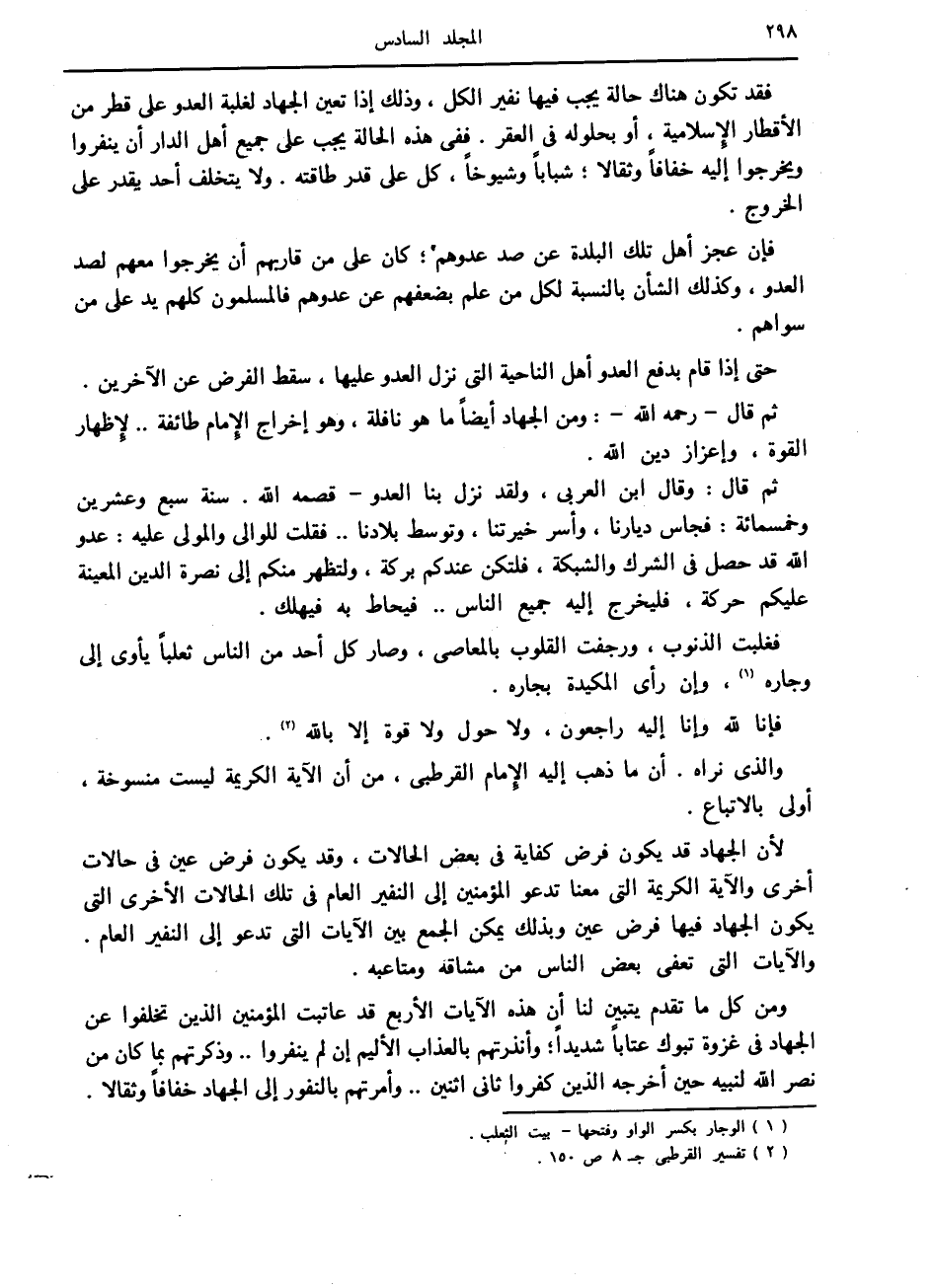 لأن الجهاد قد يكون فرض كفاية في بعض الحالات، وقد يكون فرض عين في حالات أخرى والآية الكريمة التي معنا تدعو المؤمنين إلى النفير العام في تلك الحالات الأخرى التي يكون الجهاد فيها فرض عين وبذلك يمكن الجمع بين الآيات التي تدعو إلى النفير العام.