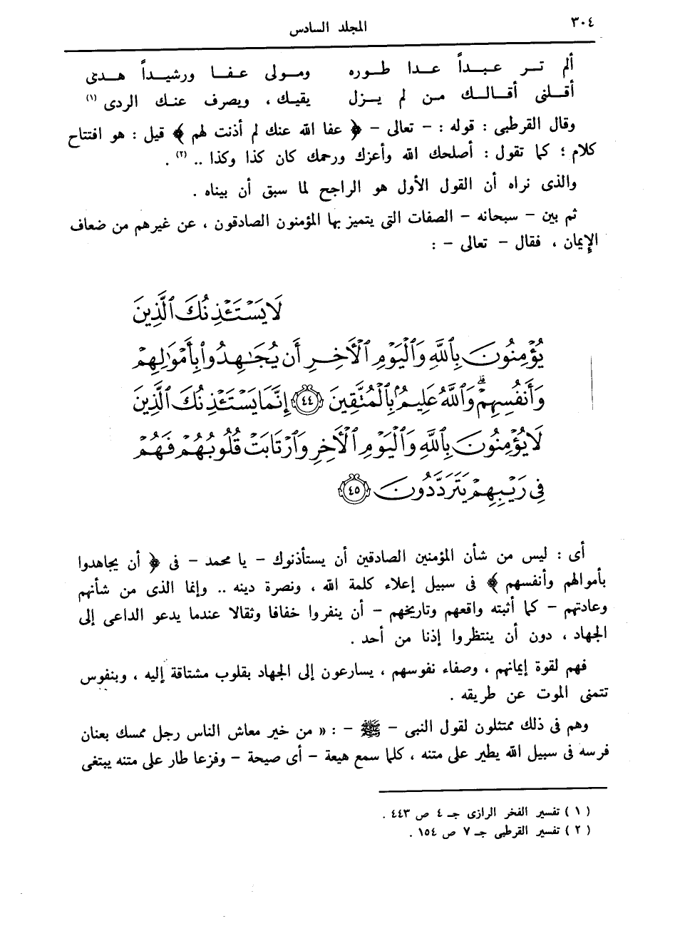 لا يَسْتَأْذِنُكَ الَّذِينَ يُؤْمِنُونَ بِاللَّهِ وَالْيَوْمِ الْآخِرِ أَنْ يُجاهِدُوا بِأَمْوالِهِمْ وَأَنْفُسِهِمْ وَاللَّهُ عَلِيمٌ بِالْمُتَّقِينَ (44) إِنَّما يَسْتَأْذِنُكَ الَّذِينَ لا يُؤْمِنُونَ بِاللَّهِ وَالْيَوْمِ الْآخِرِ وَارْتابَتْ قُلُوبُهُمْ فَهُمْ فِي رَيْبِهِمْ يَتَرَدَّدُونَ (45)