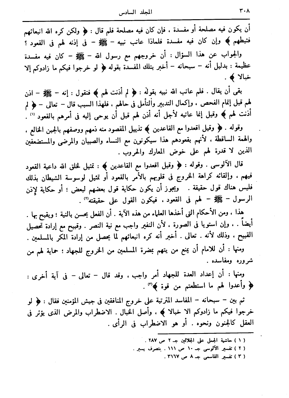 أن يكون فيه مصلحة أو مفسدة، فإن كان فيه مصلحة فلم قال: وَلكِنْ كَرِهَ اللَّهُ انْبِعاثَهُمْ فَثَبَّطَهُمْ وإن كان فيه مفسدة فلماذا عاتب نبيه صلى الله عليه وسلم في إذنه لهم في القعود؟