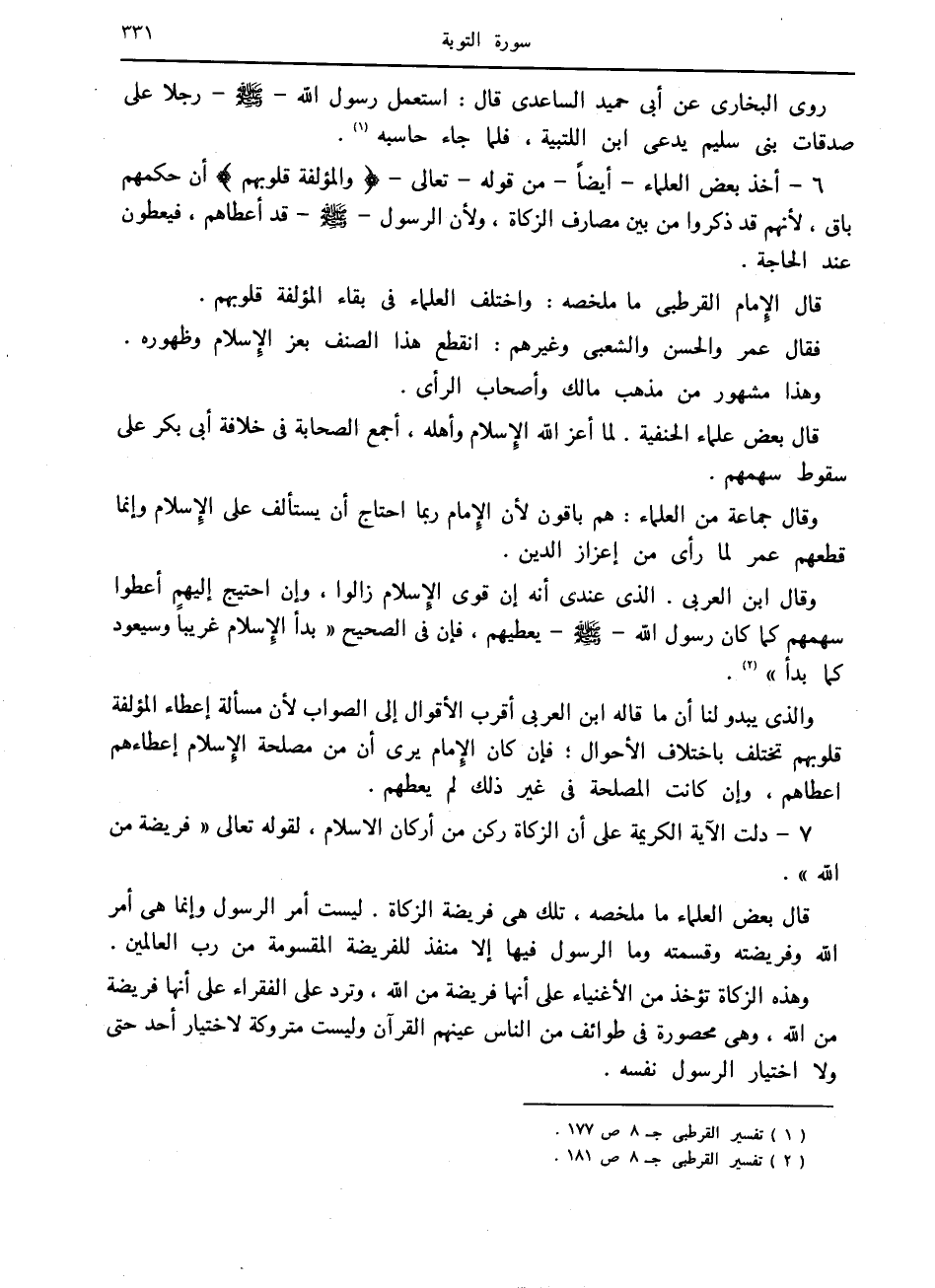 6- أخذ بعض العلماء- أيضا- من قوله- تعالى- وَالْمُؤَلَّفَةِ قُلُوبُهُمْ أن حكمهم باق، لأنهم قد ذكروا من بين مصارف الزكاة، ولأن الرسول صلى الله عليه وسلم قد أعطاهم، فيعطون عند الحاجة.