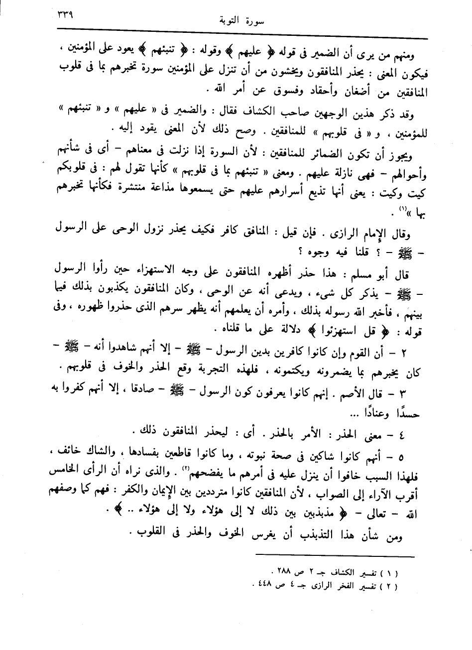 5- أنهم كانوا شاكين في صحة نبوته، وما كانوا قاطعين بفسادها، والشاك خائف، فلهذا السبب خافوا أن ينزل عليه في أمرهم ما يفضحهم «2» . والذي نراه أن الرأى الخامس أقرب الآراء إلى الصواب، لأن المنافقين كانوا مترددين بين الإيمان والكفر: فهم كما وصفهم الله- تعالى- مُذَبْذَبِينَ بَيْنَ ذلِكَ لا إِلى هؤُلاءِ وَلا إِلى هؤُلاءِ....