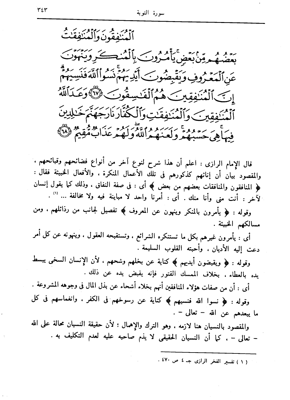 الْمُنافِقُونَ وَالْمُنافِقاتُ بَعْضُهُمْ مِنْ بَعْضٍ يَأْمُرُونَ بِالْمُنْكَرِ وَيَنْهَوْنَ عَنِ الْمَعْرُوفِ وَيَقْبِضُونَ أَيْدِيَهُمْ نَسُوا اللَّهَ فَنَسِيَهُمْ إِنَّ الْمُنافِقِينَ هُمُ الْفاسِقُونَ (67) وَعَدَ اللَّهُ الْمُنافِقِينَ وَالْمُنافِقاتِ وَالْكُفَّارَ نارَ جَهَنَّمَ خالِدِينَ فِيها هِيَ حَسْبُهُمْ وَلَعَنَهُمُ اللَّهُ وَلَهُمْ عَذابٌ مُقِيمٌ (68)