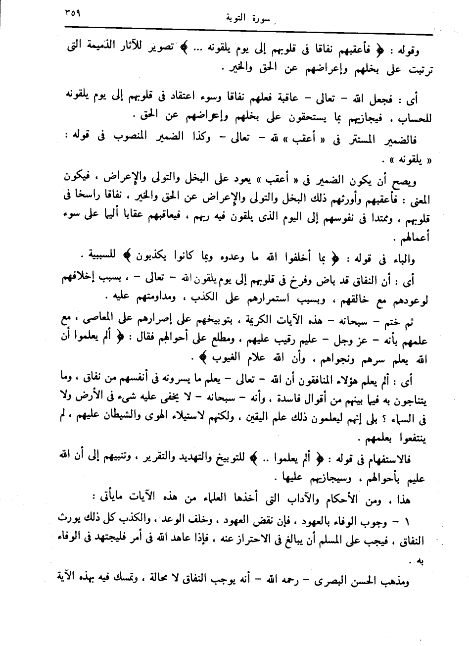 ويصح أن يكون الضمير في «أعقب» يعود على البخل والتولي والإعراض، فيكون المعنى: فأعقبهم وأورثهم ذلك البخل والتولي والإعراض عن الحق والخير، نفاقا راسخا في قلوبهم، وممتدا في نفوسهم إلى اليوم الذي يلقون فيه ربهم، فيعاقبهم عقابا أليما على سوء أعمالهم.