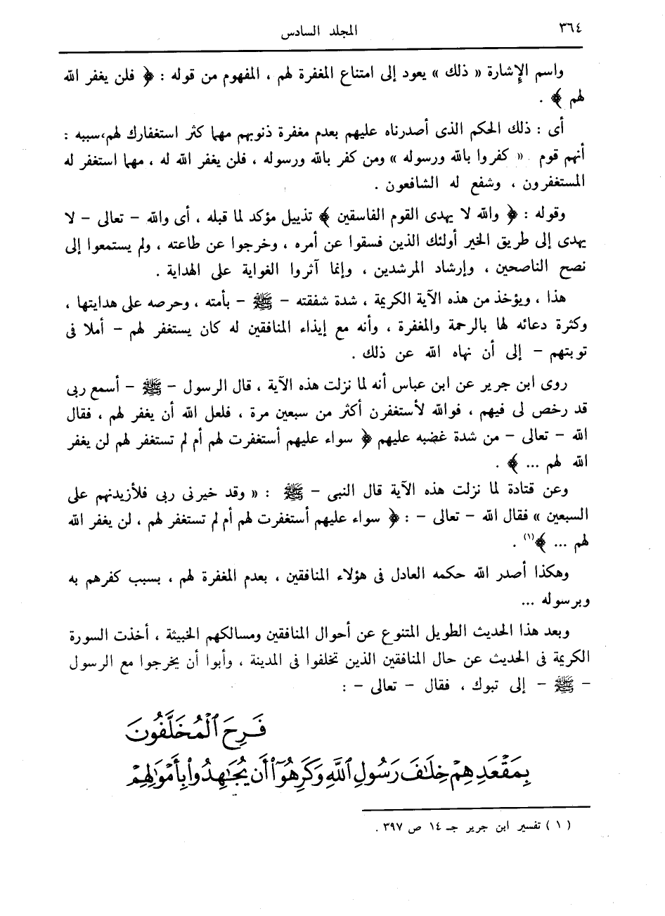 روى ابن جرير عن ابن عباس أنه لما نزلت هذه الآية، قال الرسول صلى الله عليه وسلم أسمع ربي قد رخص لي فيهم، فو الله لأستغفرن أكثر من سبعين مرة، فلعل الله أن يغفر لهم، فقال الله- تعالى- من شدة غضبه عليهم سَواءٌ عَلَيْهِمْ أَسْتَغْفَرْتَ لَهُمْ أَمْ لَمْ تَسْتَغْفِرْ لَهُمْ، لَنْ يَغْفِرَ اللَّهُ لَهُمْ ... «1» .