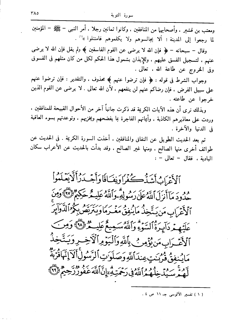 ثم بعد الحديث الطويل عن النفاق والمنافقين، أخذت السورة الكريمة. في الحديث عن طوائف أخرى منها الصالح، ومنها غير الصالح، وقد بدأت بالحديث عن الأعراب سكان البادية، فقال- تعالى-: