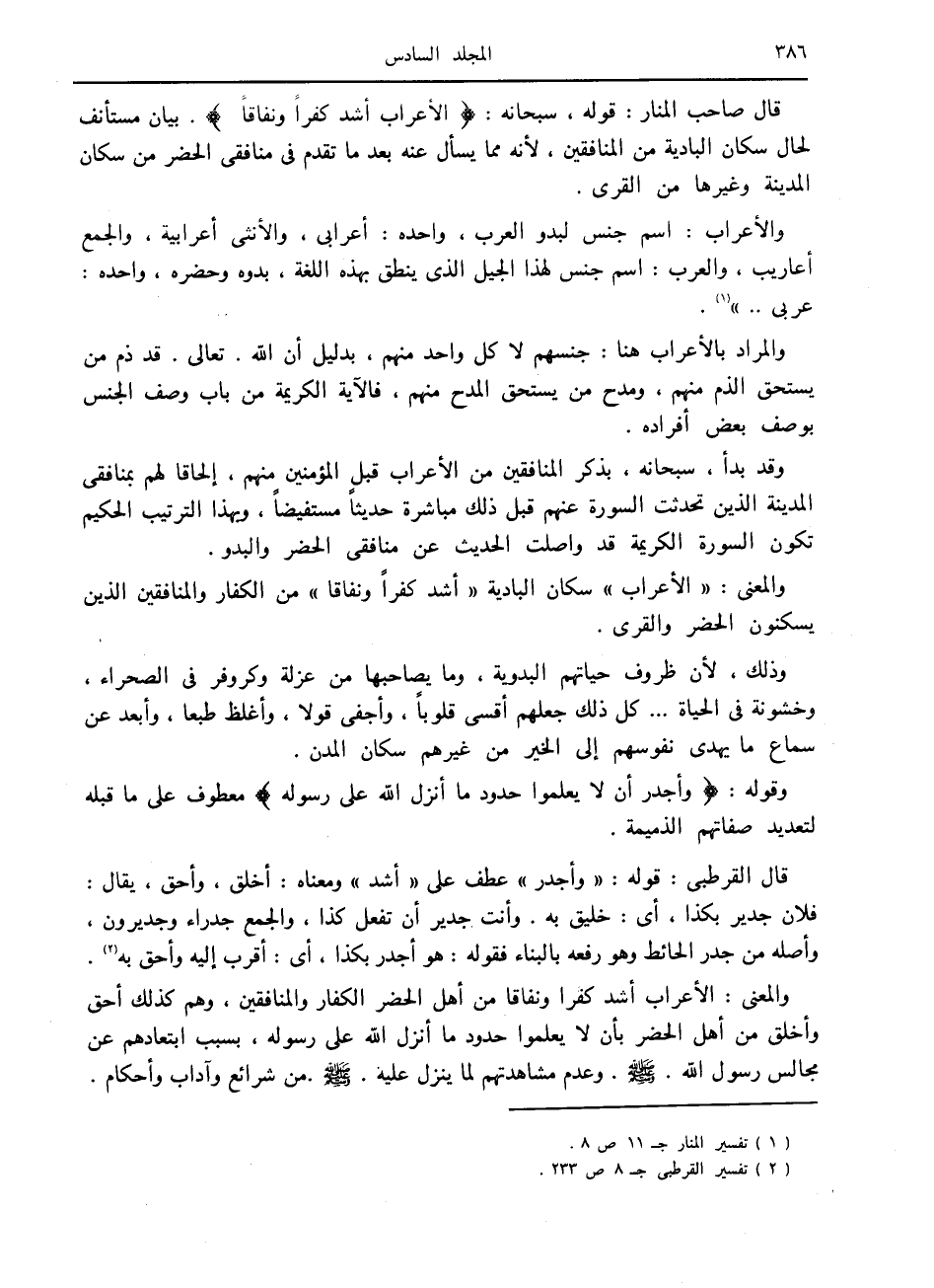 قال صاحب المنار: قوله، سبحانه: الْأَعْرابُ أَشَدُّ كُفْراً وَنِفاقاً. بيان مستأنف لحال سكان البادية من المنافقين، لأنه مما يسأل عنه بعد ما تقدم في منافقي الحضر من سكان المدينة وغيرها من القرى.