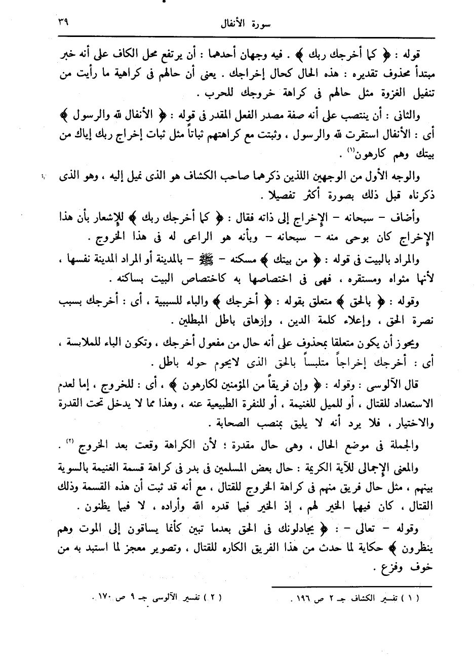 قوله: كَما أَخْرَجَكَ رَبُّكَ. فيه وجهان أحدهما: أن يرتفع محل الكاف على أنه خبر مبتدأ محذوف تقديره: هذه الحال كحال إخراجك. يعنى أن حالهم في كراهية ما رأيت من تنفيل الغزوة مثل حالهم في كراهة خروجك للحرب.