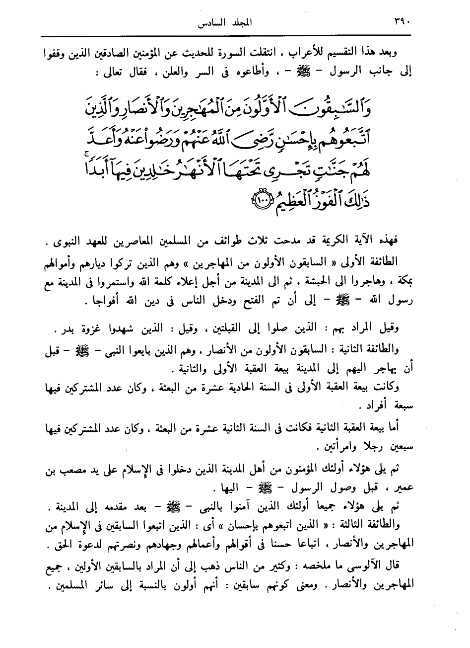 وَالسَّابِقُونَ الْأَوَّلُونَ مِنَ الْمُهاجِرِينَ وَالْأَنْصارِ وَالَّذِينَ اتَّبَعُوهُمْ بِإِحْسانٍ رَضِيَ اللَّهُ عَنْهُمْ وَرَضُوا عَنْهُ وَأَعَدَّ لَهُمْ جَنَّاتٍ تَجْرِي تَحْتَهَا الْأَنْهارُ خالِدِينَ فِيها أَبَداً ذلِكَ الْفَوْزُ الْعَظِيمُ (100)
