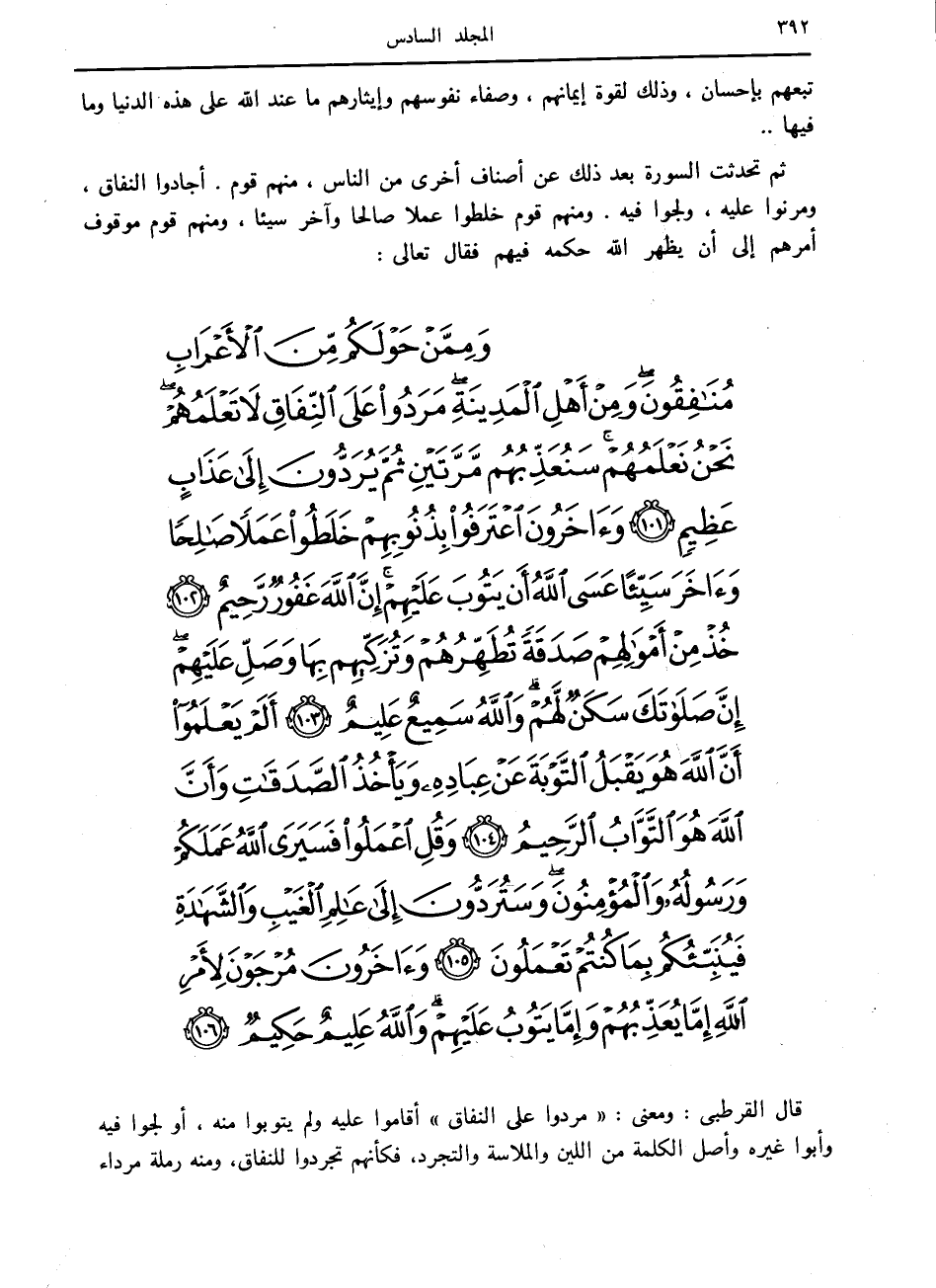 وَمِمَّنْ حَوْلَكُمْ مِنَ الْأَعْرابِ مُنافِقُونَ وَمِنْ أَهْلِ الْمَدِينَةِ مَرَدُوا عَلَى النِّفاقِ لا تَعْلَمُهُمْ نَحْنُ نَعْلَمُهُمْ سَنُعَذِّبُهُمْ مَرَّتَيْنِ ثُمَّ يُرَدُّونَ إِلى عَذابٍ عَظِيمٍ (101) وَآخَرُونَ اعْتَرَفُوا بِذُنُوبِهِمْ خَلَطُوا عَمَلاً صالِحاً وَآخَرَ سَيِّئاً عَسَى اللَّهُ أَنْ يَتُوبَ عَلَيْهِمْ إِنَّ اللَّهَ غَفُورٌ رَحِيمٌ (102) خُذْ مِنْ أَمْوالِهِمْ صَدَقَةً تُطَهِّرُهُمْ وَتُزَكِّيهِمْ بِها وَصَلِّ عَلَيْهِمْ إِنَّ صَلاتَكَ سَكَنٌ لَهُمْ وَاللَّهُ سَمِيعٌ عَلِيمٌ (103) أَلَمْ يَعْلَمُوا أَنَّ اللَّهَ هُوَ يَقْبَلُ التَّوْبَةَ عَنْ عِبادِهِ وَيَأْخُذُ الصَّدَقاتِ وَأَنَّ اللَّهَ هُوَ التَّوَّابُ الرَّحِيمُ (104) وَقُلِ اعْمَلُوا فَسَيَرَى اللَّهُ عَمَلَكُمْ وَرَسُولُهُ وَالْمُؤْمِنُونَ وَسَتُرَدُّونَ إِلى عالِمِ الْغَيْبِ وَالشَّهادَةِ فَيُنَبِّئُكُمْ بِما كُنْتُمْ تَعْمَلُونَ (105)
