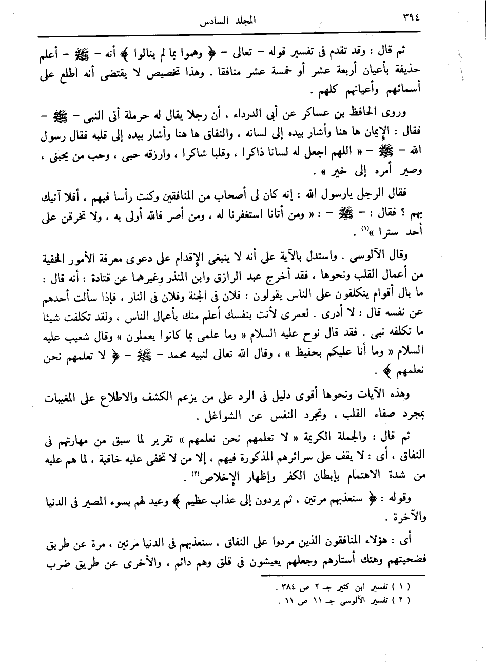 ثم قال: وقد تقدم في تفسير قوله- تعالى- وَهَمُّوا بِما لَمْ يَنالُوا أنه صلى الله عليه وسلم أعلم حذيفة بأعيان أربعة عشر أو خمسة عشر منافقا. وهذا تخصيص لا يقتضى أنه اطلع على أسمائهم وأعيانهم كلهم.