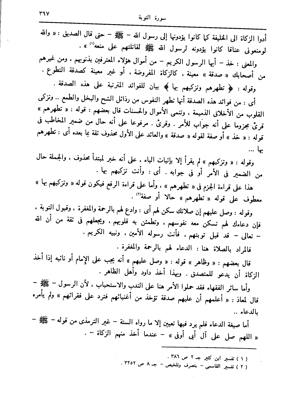 هذا على قراءة الجزم في «تطهرهم» ، وأما على قراءة الرفع فيكون قوله «وتزكيهم بها» معطوف على قوله «تطهرهم» حالا أو صفة «2» .