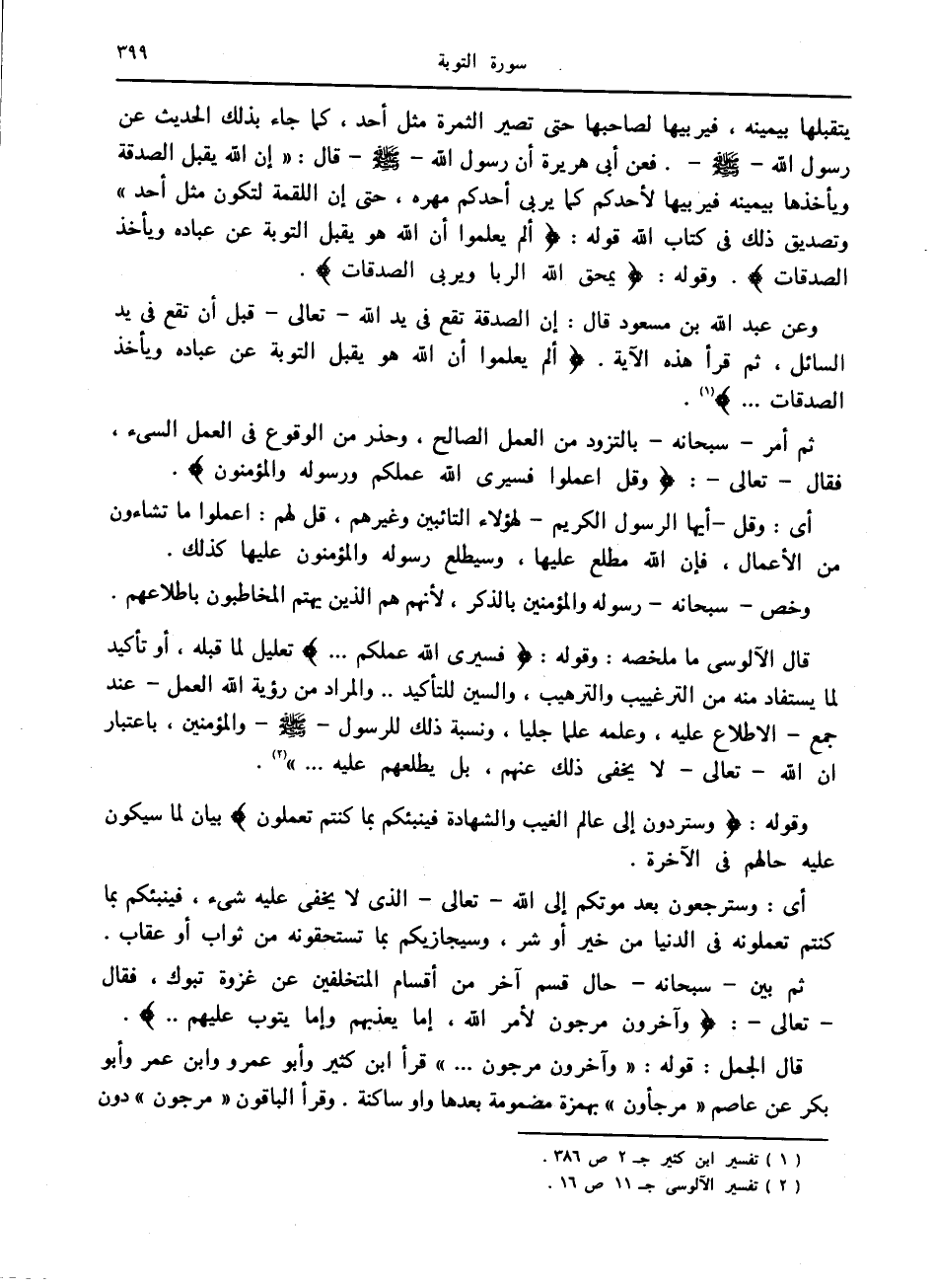 يتقبلها بيمينه، فيربيها لصاحبها حتى تصير الثمرة مثل أحد، كما جاء بذلك الحديث عن رسول الله صلى الله عليه وسلم. فعن أبى هريرة أن رسول الله صلى الله عليه وسلم قال: «إن الله يقبل الصدقة ويأخذها بيمينه فيربيها لأحدكم كما يربى أحدكم مهره، حتى إن اللقمة لتكون مثل أحد» وتصديق ذلك في كتاب الله قوله: أَلَمْ يَعْلَمُوا أَنَّ اللَّهَ هُوَ يَقْبَلُ التَّوْبَةَ عَنْ عِبادِهِ وَيَأْخُذُ الصَّدَقاتِ. وقوله: يَمْحَقُ اللَّهُ الرِّبا وَيُرْبِي الصَّدَقاتِ.