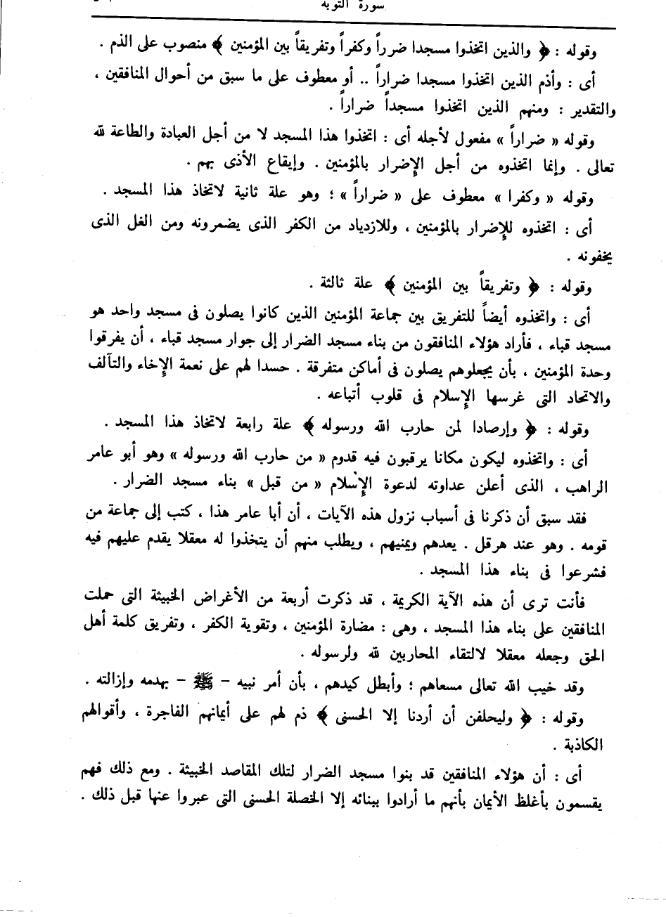 فأنت ترى أن هذه الآية الكريمة، قد ذكرت أربعة من الأغراض الخبيثة التي حملت المنافقين على بناء هذا المسجد، وهي: مضارة المؤمنين، وتقوية الكفر، وتفريق كلمة أهل الحق وجعله معقلا لالتقاء المحاربين لله ولرسوله.