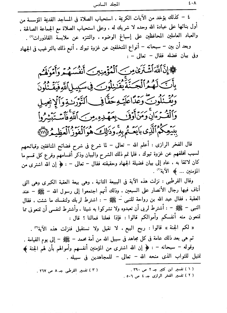 إِنَّ اللَّهَ اشْتَرى مِنَ الْمُؤْمِنِينَ أَنْفُسَهُمْ وَأَمْوالَهُمْ بِأَنَّ لَهُمُ الْجَنَّةَ يُقاتِلُونَ فِي سَبِيلِ اللَّهِ فَيَقْتُلُونَ وَيُقْتَلُونَ وَعْداً عَلَيْهِ حَقًّا فِي التَّوْراةِ وَالْإِنْجِيلِ وَالْقُرْآنِ وَمَنْ أَوْفى بِعَهْدِهِ مِنَ اللَّهِ فَاسْتَبْشِرُوا بِبَيْعِكُمُ الَّذِي بايَعْتُمْ بِهِ وَذلِكَ هُوَ الْفَوْزُ الْعَظِيمُ (111)