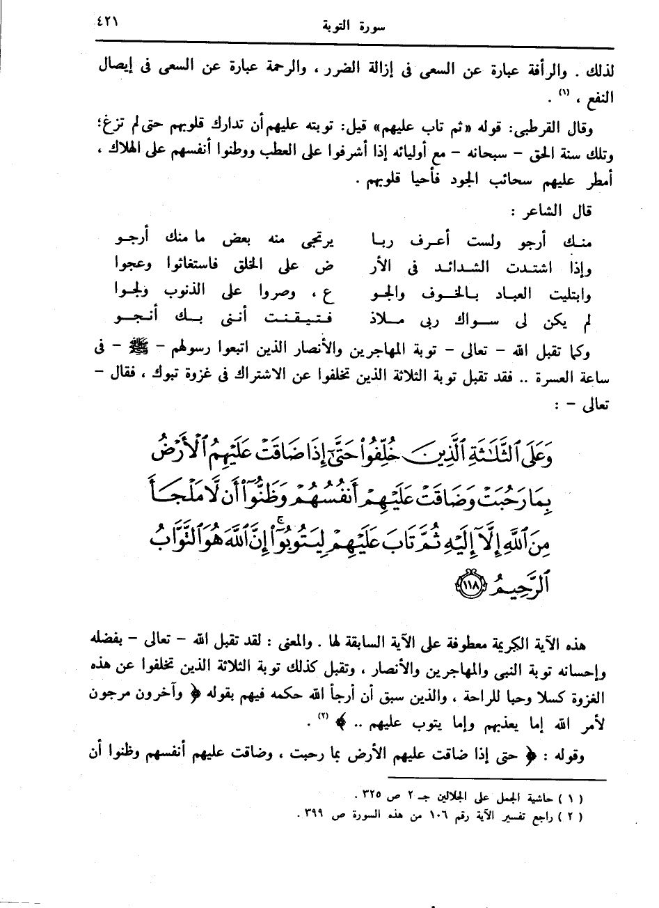 وَعَلَى الثَّلاثَةِ الَّذِينَ خُلِّفُوا حَتَّى إِذا ضاقَتْ عَلَيْهِمُ الْأَرْضُ بِما رَحُبَتْ وَضاقَتْ عَلَيْهِمْ أَنْفُسُهُمْ وَظَنُّوا أَنْ لا مَلْجَأَ مِنَ اللَّهِ إِلاَّ إِلَيْهِ ثُمَّ تابَ عَلَيْهِمْ لِيَتُوبُوا إِنَّ اللَّهَ هُوَ التَّوَّابُ الرَّحِيمُ (118)
