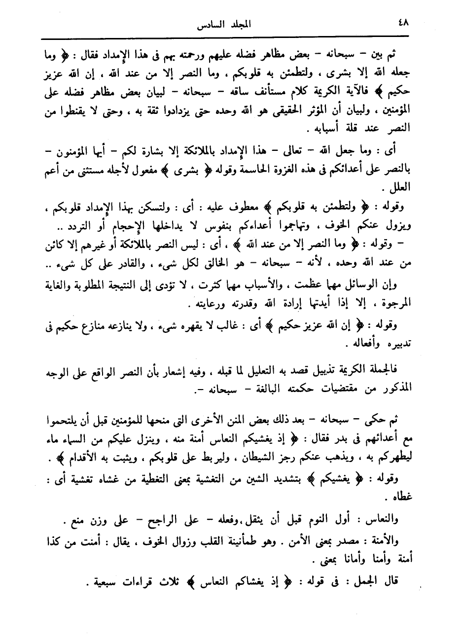 ثم بين- سبحانه- بعض مظاهر فضله عليهم ورحمته بهم في هذا الإمداد فقال: وَما جَعَلَهُ اللَّهُ إِلَّا بُشْرى، وَلِتَطْمَئِنَّ بِهِ قُلُوبُكُمْ، وَمَا النَّصْرُ إِلَّا مِنْ عِنْدِ اللَّهِ، إِنَّ اللَّهَ عَزِيزٌ حَكِيمٌ فالآية الكريمة كلام مستأنف ساقه- سبحانه- لبيان بعض مظاهر فضله على المؤمنين، ولبيان أن المؤثر الحقيقي هو الله وحده حتى يزدادوا ثقة به، وحتى لا يقنطوا من النصر عند قلة أسبابه.