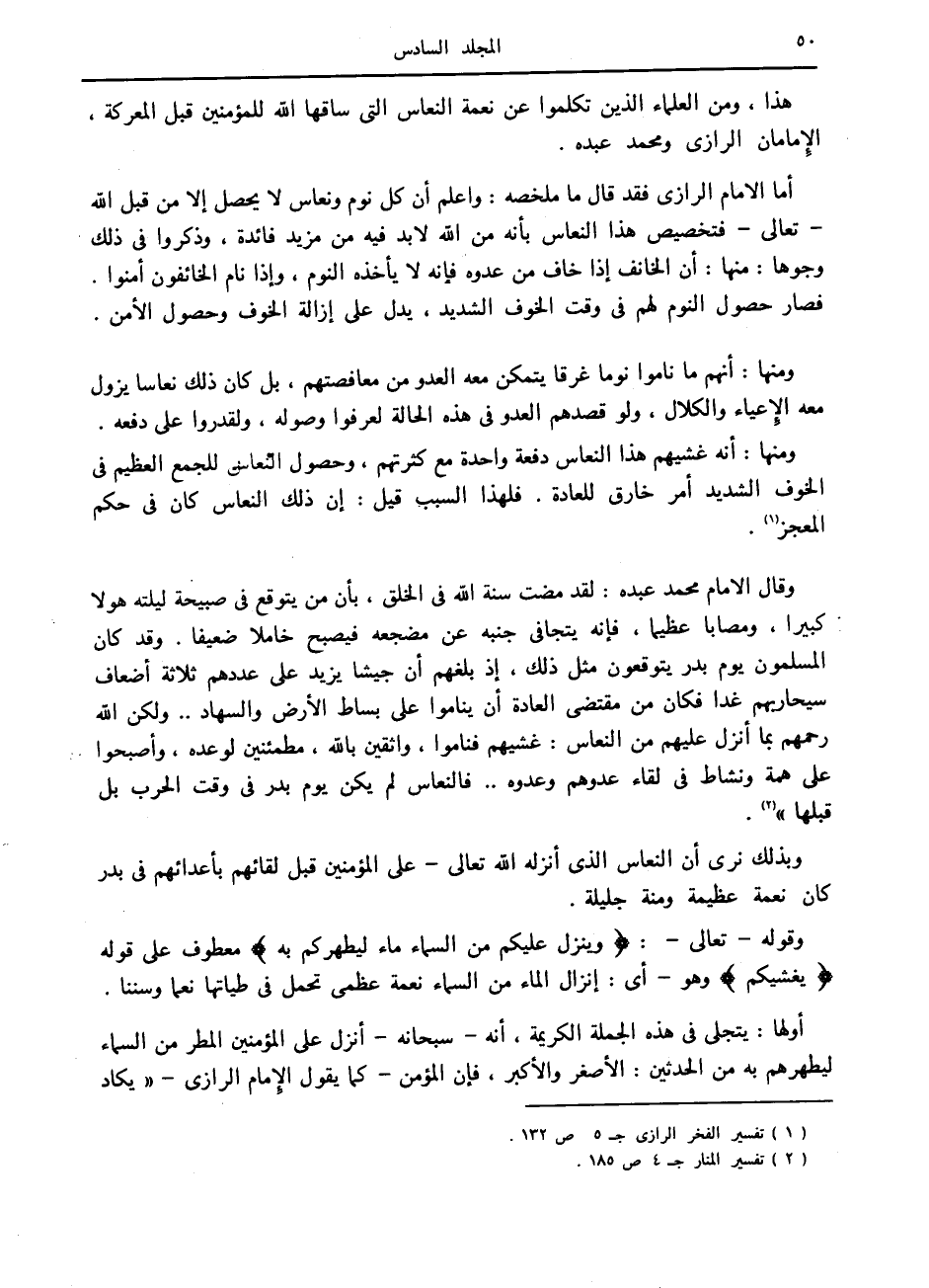 هذا، ومن العلماء الذين تكلموا عن نعمة النعاس التي ساقها الله للمؤمنين قبل المعركة، الإمامان الرازي ومحمد عبده.