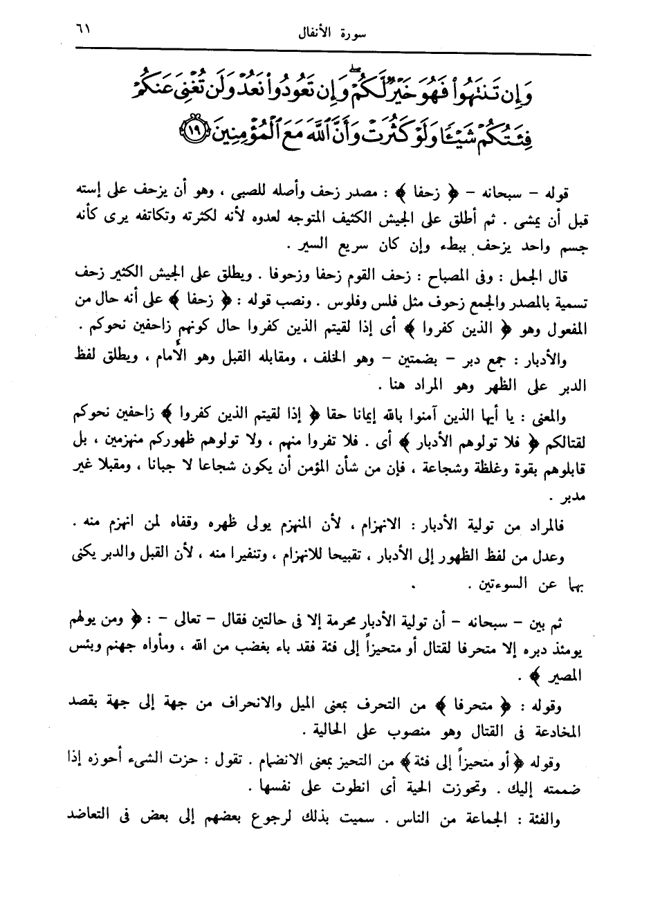 ثم بين- سبحانه- أن تولية الأدبار محرمة إلا في حالتين فقال- تعالى-: وَمَنْ يُوَلِّهِمْ يَوْمَئِذٍ دُبُرَهُ إِلَّا مُتَحَرِّفاً لِقِتالٍ أَوْ مُتَحَيِّزاً إِلى فِئَةٍ فَقَدْ باءَ بِغَضَبٍ مِنَ اللَّهِ، وَمَأْواهُ جَهَنَّمُ وَبِئْسَ الْمَصِيرُ.