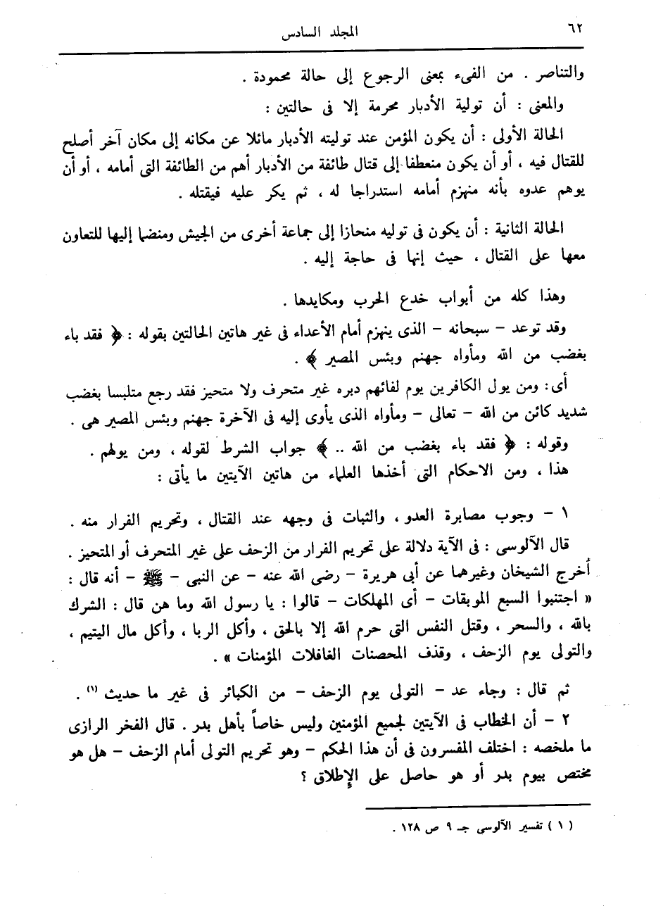 الحالة الأولى: أن يكون المؤمن عند توليته الأدبار مائلا عن مكانه إلى مكان آخر أصلح للقتال فيه، أو أن يكون منعطفا إلى قتال طائفة من الأدبار أهم من الطائفة التي أمامه، أو أن يوهم عدوه بأنه منهزم أمامه استدراجا له، ثم يكر عليه فيقتله.