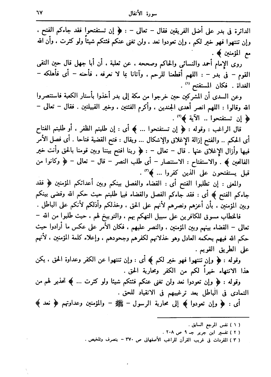 قال الراغب: وقوله: إِنْ تَسْتَفْتِحُوا ... أى: إن طلبتم الظفر، أو طلبتم الفتاح أى الحكم.. والفتح إزالة الإغلاق والإشكال ... ويقال: فتح القضية فتاحا. أى فصل الأمر فيها وأزال الإغلاق عنها. قال- تعالى-: رَبَّنَا افْتَحْ بَيْنَنا وَبَيْنَ قَوْمِنا بِالْحَقِّ وَأَنْتَ خَيْرُ الْفاتِحِينَ. والاستفتاح: الاستنصار- أى طلب النصر- قال- تعالى- وَكانُوا مِنْ قَبْلُ يَسْتَفْتِحُونَ عَلَى الَّذِينَ كَفَرُوا ... «3» .
