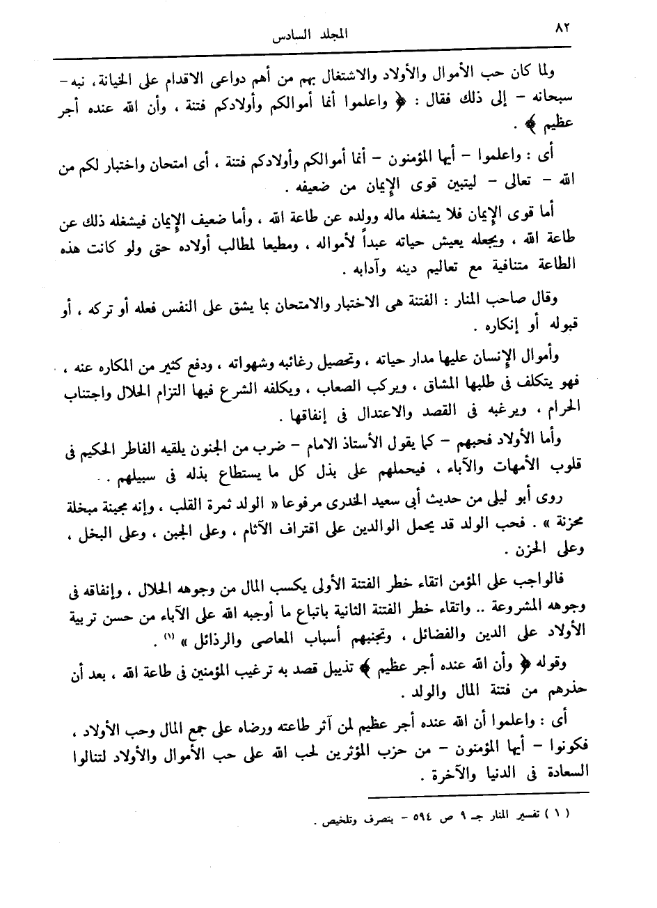 فالواجب على المؤمن اتقاء خطر الفتنة الأولى يكسب المال من وجوهه الحلال، وإنفاقه في وجوهه المشروعة.. واتقاء خطر الفتنة الثانية باتباع ما أوجبه الله على الآباء من حسن تربية الأولاد على الدين والفضائل، وتجنبهم أسباب المعاصي والرذائل» «1» .