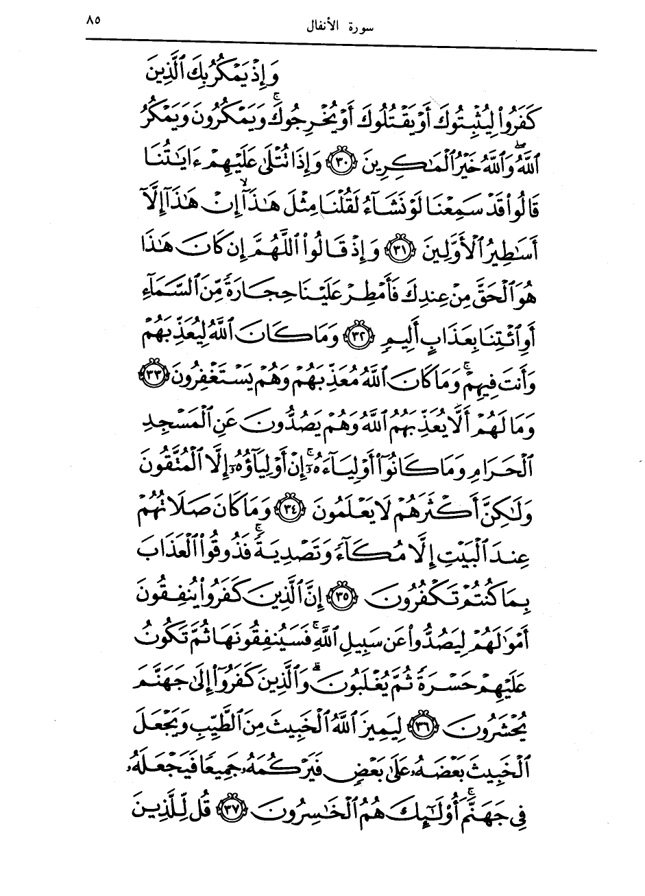 وَإِذْ يَمْكُرُ بِكَ الَّذِينَ كَفَرُوا لِيُثْبِتُوكَ أَوْ يَقْتُلُوكَ أَوْ يُخْرِجُوكَ وَيَمْكُرُونَ وَيَمْكُرُ اللَّهُ وَاللَّهُ خَيْرُ الْماكِرِينَ (30) وَإِذا تُتْلى عَلَيْهِمْ آياتُنا قالُوا قَدْ سَمِعْنا لَوْ نَشاءُ لَقُلْنا مِثْلَ هذا إِنْ هذا إِلاَّ أَساطِيرُ الْأَوَّلِينَ (31) وَإِذْ قالُوا اللَّهُمَّ إِنْ كانَ هذا هُوَ الْحَقَّ مِنْ عِنْدِكَ فَأَمْطِرْ عَلَيْنا حِجارَةً مِنَ السَّماءِ أَوِ ائْتِنا بِعَذابٍ أَلِيمٍ (32) وَما كانَ اللَّهُ لِيُعَذِّبَهُمْ وَأَنْتَ فِيهِمْ وَما كانَ اللَّهُ مُعَذِّبَهُمْ وَهُمْ يَسْتَغْفِرُونَ (33) وَما لَهُمْ أَلاَّ يُعَذِّبَهُمُ اللَّهُ وَهُمْ يَصُدُّونَ عَنِ الْمَسْجِدِ الْحَرامِ وَما كانُوا أَوْلِياءَهُ إِنْ أَوْلِياؤُهُ إِلاَّ الْمُتَّقُونَ وَلكِنَّ أَكْثَرَهُمْ لا يَعْلَمُونَ (34)