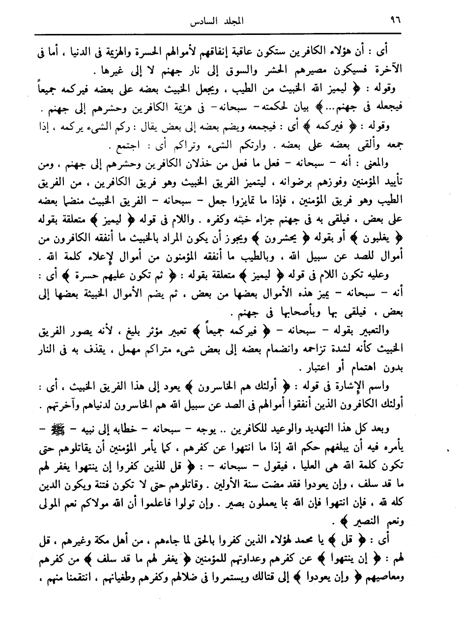وقوله: لِيَمِيزَ اللَّهُ الْخَبِيثَ مِنَ الطَّيِّبِ، وَيَجْعَلَ الْخَبِيثَ بَعْضَهُ عَلى بَعْضٍ فَيَرْكُمَهُ جَمِيعاً فَيَجْعَلَهُ فِي جَهَنَّمَ ... بيان لحكمته- سبحانه- في هزيمة الكافرين وحشرهم إلى جهنم.